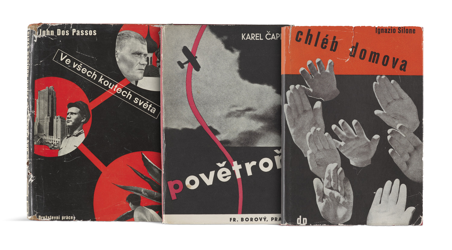Moderne Literatur und Kunst – Enthält: Karel Capek. Povetron. Prag, Fr. Borovy, 1934. 222 S., 3 Bll. John dos Passos. Ve vsech koutech sveta. Prag, Druzstevni práce, 1935. 224 S., 4 Bll. - Ignazio Silone. Chléb domova. Prag, Druzstevni práce, 1937. 400 S., 2 Bll. - Papierbedingt zart u. sehr gleichmäßig gebräunt, 2 Ex. vermutl. mit erneuerten Vorsätzen. Insgesamt sehr gut erhaltene u. saubere Exemplare, selten je mit den orig. ill. Schutzumschlägen.