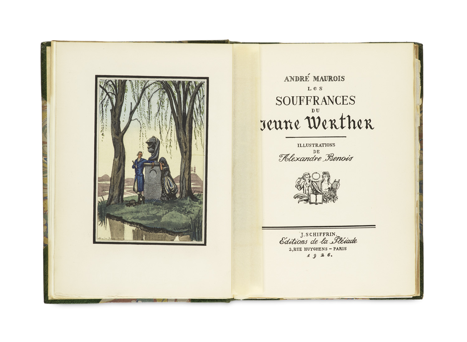 Les souffrances du jeune Werther. Mit 16, wovon 5 ganzseitigen, von Saudé kolorierten und Maccard gestochenen Radierungen in Kupfer sowie 21, teils kolorierten Vignetten und Initialen nach Zeichnungen von A. Benois. Paris, La Pléiade, Schiffrin (Coulouma), 1926. 2 Bl. w., 128 (4) S. Gr.-8°. Meisterhafter Halb-Maroquin (sign. W. H. Smith and Son) mit goldgepr. RTit. u. Deckelgold- u. Blindpräg., die Decken bezogen mit mehrfarb. Schneckenmarmorpapier und mit Kopfgoldschnitt (an den Ecken und Kanten gering berieben).