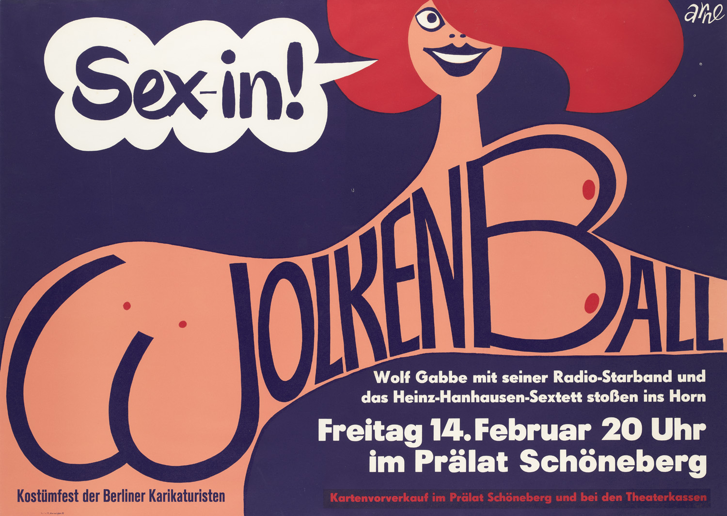 Sammlung von 63 Plakaten für den "Wolkenball". Kostümfest der Berliner Karikaturisten im Prälat in Schöneberg. Lithographien u. Linol-Drucke (Berek u.a.). Berlin, 1960er bis 1980er-Jahre. Format je ca. 60 x 83 cm.