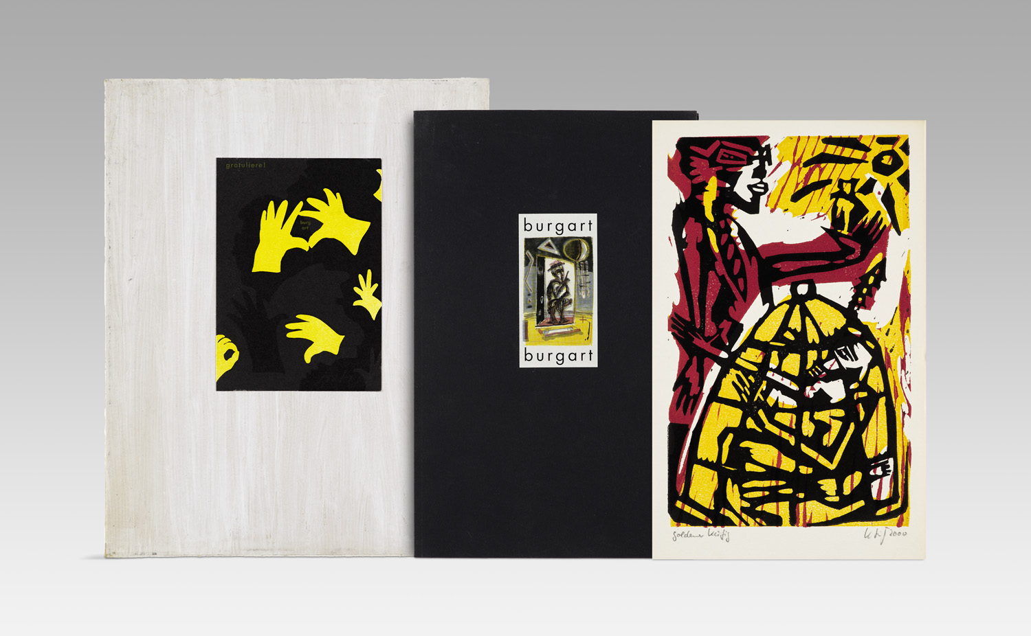 Moderne Literatur und Kunst – Eins von 30 (GA 75) Exemplaren der Vorzugsausgabe. - Album mit 40 originalgraphischen Grüßen von Autoren, Künstlern und Verlegern zum Jubiläum der Burgart-Presse. - Enthält Arbeiten von Christiane Baumgartner, Matthias Biskupek, Frank Eißner, Felix Martin Furtwängler, Sabine Golde, Wolgang Henne, Karl-Georg Hirsch, Helge Leiberg, Michael Morgner, Thomas Ranft, Horst Sakulowski, Klaus Süß, Ulrich Tarlatt, Max Uhlig, Kay Voigtmann, Steffen Volmer u.a. - Das Textblatt mit Inhaltsverzeichnis und Druckvermerk ist beigelegt. - Dabei: Zehn Jahre Burgrt. Ein Almanach. Rudolstadt 2000. 4°. OKarton. Expl. für Wolf Rosenthal mit Widmung auf Vorsatz. Beiliegt: Farbiger Orig.-Holzschnitt von Klaus Süß "Goldener Käfig", sign. u. datiert. Rückseitig mit Verlagsstempel.