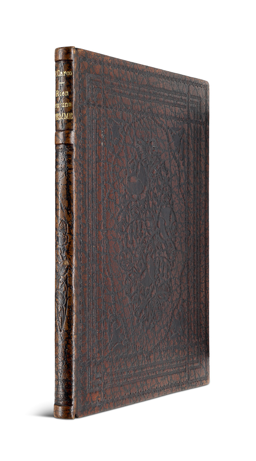 Modern Literature and Art – Rien qu'une femme. With 7 original etchings by Maurice Asselin. Hand-bound dark brown full leather volume with rich floral blind embossing and blind-stamped cover borders, gilt spine title and gilt head edge (René Kieffer, Paris).