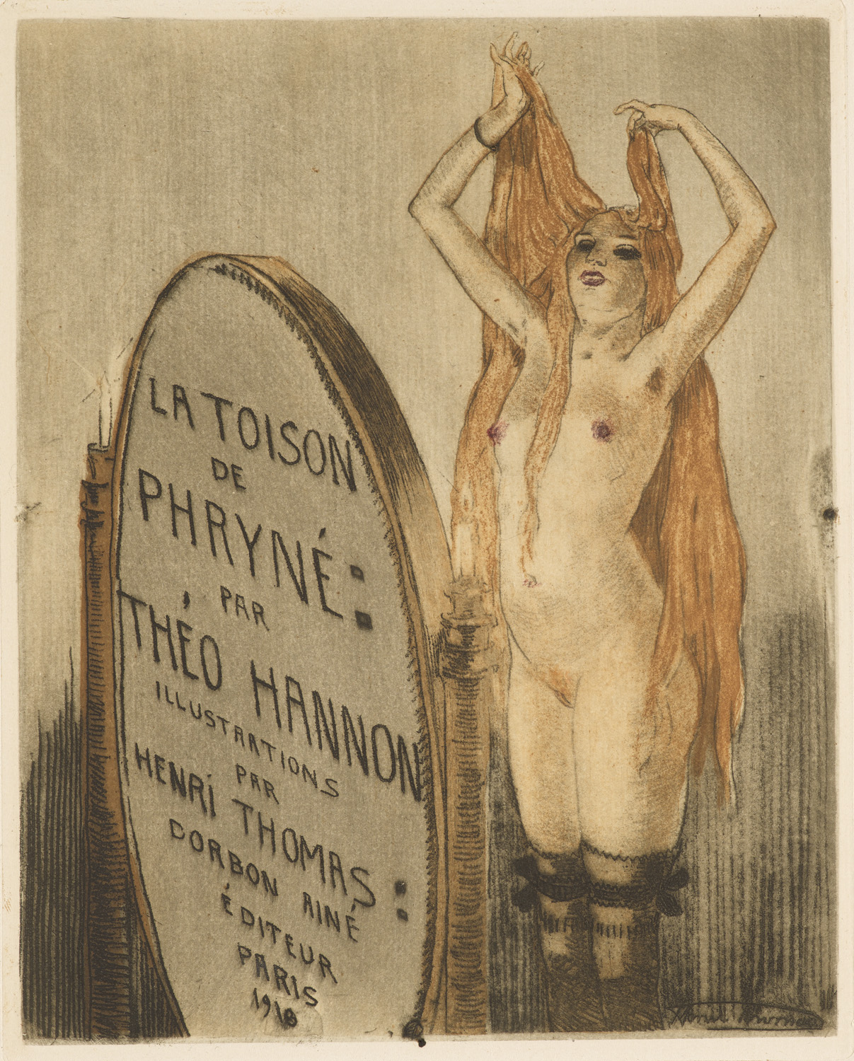 La Toison de Phryné. Mit radiertem Titel und Frontispiz und 10 ganzs. Radierungen von Henri Thomas. Paris, Dorbon-Ainé, 1913. 91 S. 4°. OBroschur mit Fadenbindung in OUmschlag mit DTitel (etwas gebräunt).