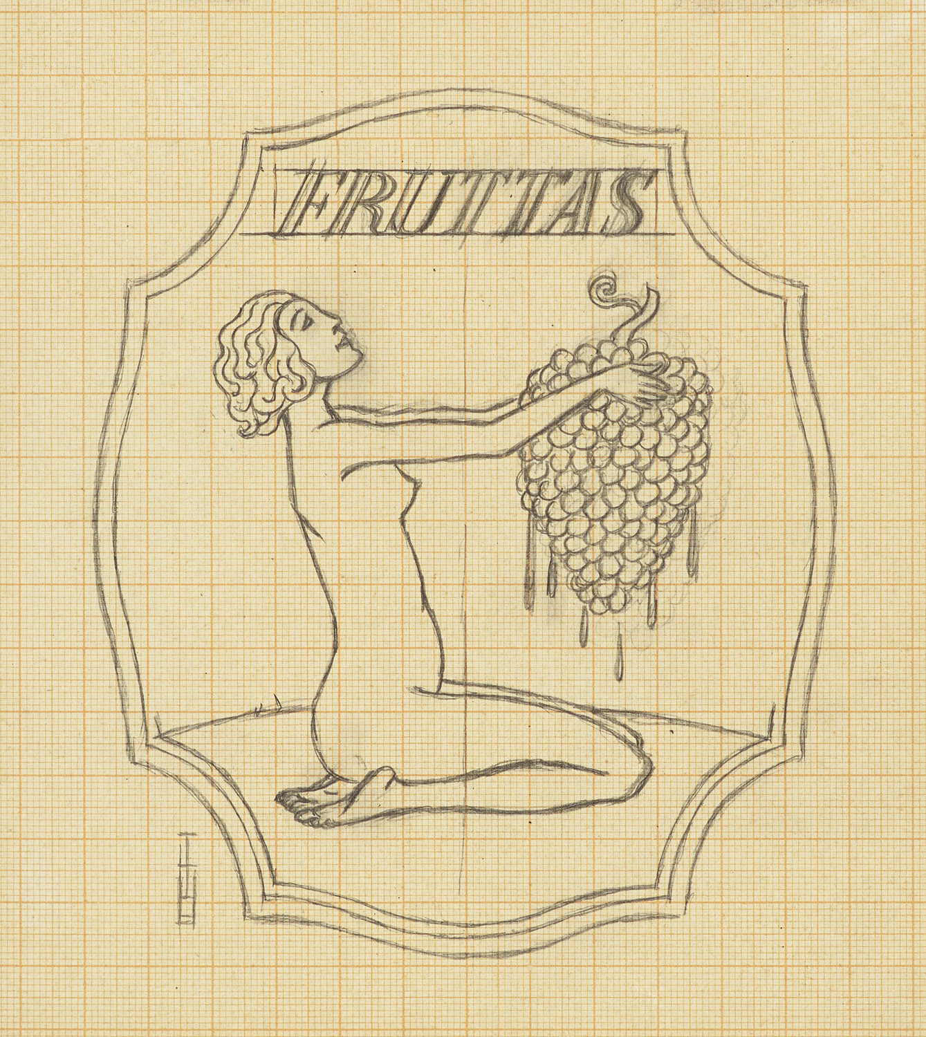 Fruttas. Bleistiftzeichnung auf Millimeterpapier. 17 x 15 cm Sichtmaß. Unter Glas gerahmt. Ungeöffnet. Monogrammiert.