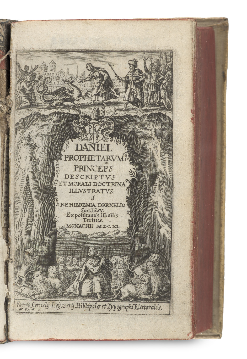 Daniel Prophetarum princeps descriptus et morali doctrina illustratus. Ex posthumis libellis tertius. Mit gestoch. Titel von W. Kilian und: Joseph Aegypti Prorex descriptus et morali doctrina illustratus. 2 Teile in 1 Bd. Mit je einem gestochenem Titel. München, Leysser, 1640. 9 Bll, 459 S., 11 Bll., 441 S., 1 Bl. 12°. Pgt. d. Zt. mit reicher Blindprägung und hs. RSchild (berieben und angestaubt, Ecken leicht bestoßen, Rückstände am Rücken).