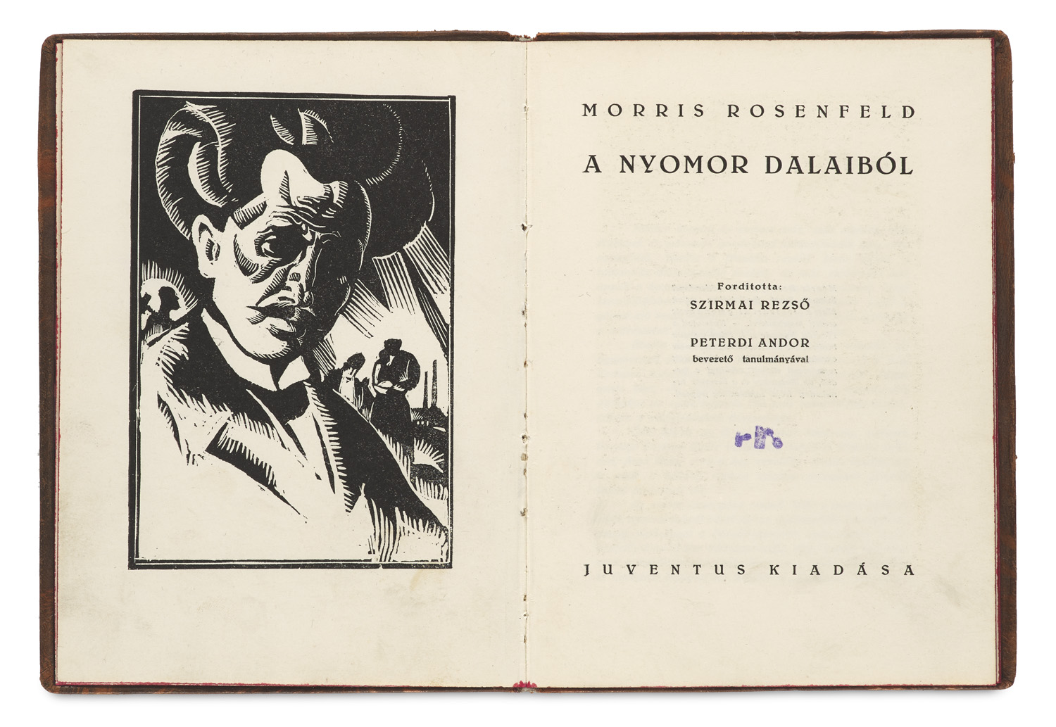 Modern Literature and Art – Frontispiece and 7 plates. First Hungarian edition. Original leather with design and red edges. (Slightly bumped and wear on the corners and spine.) - One of 500 copies. - Illustrated anthology of the Polish-Yiddish poets Morris Rosenfeld's (1862-1923) poems. With eight expressionist illustrations by Zsigmond Kolozsvári (Sigismond Kolos-Vary, 1899-1983) the Hungarian born Swiss graphic artist, painter and sculptor. - Hand-written annotation. - Inner joints reinforced. Very slightly stained. In good condition.
