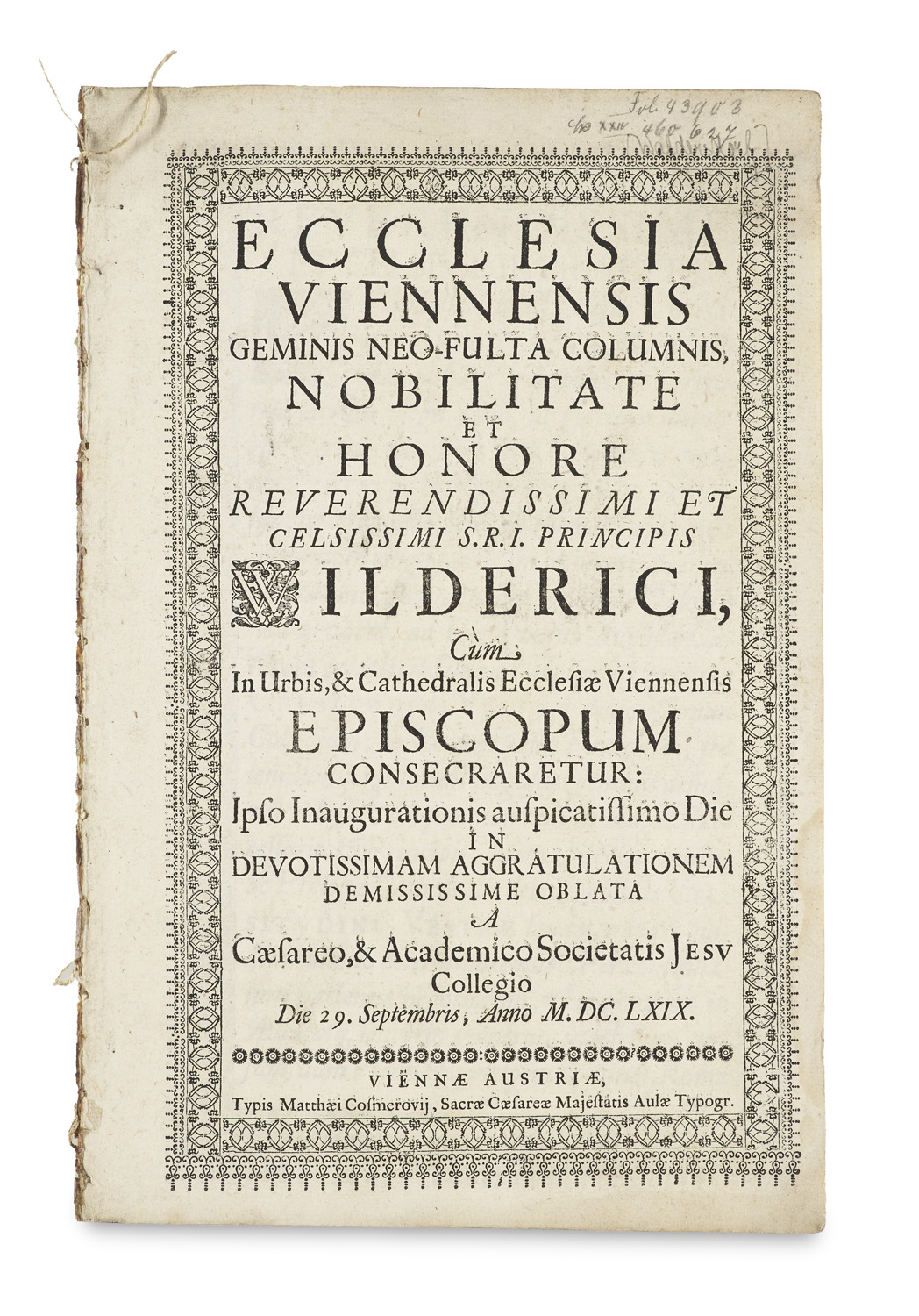 Theologie und Religionswissenschaften – Enthält: Oratio habita Romae in Sacello Apostolico ... Clemente PP VIII. Rom, 1603. - Oratio habita Romae a Stephano Roiz de Toar ... 1610. Ebd., 1611. - Preces et Orationes Recitandae .... Ebd., 1625. - Ancienne Heresie des Jesuites ... puclié sous le Nom de Mr. L'Evesque d'Arras ... 1697. - Peccatum argumentum trium Meditationum quas in Adamo, et Adami posteris ... 1774 . - Ecclesia Viennensis geminis Neo-Fulta Columnis Bonilitate ... Wilderici ... 1669. - Antidotus contra Scandalum Apostasiae, Datum ab lis ... Hermanno Lignarido. Bern, 1698. - Programma II. De Labore Scholastico. Johannes Elsholtzius ... 1684. - Programma ... Ex Museolo Johannes Böderikus. 1687. - Programma Stylo Archaico ... Carolus Etzardus Bodikerus. o.J. - Serenissimo ... Domino Friderico ... 1715. - Henrici Leonhardi Schurzfleischii Curae Posteriores ... Chronicum Hieronymi Latinum ... Jena, 1714. - VD18 11601957. - ... De Canonica Praelatorum Eccleaiae Electione ... Immanuele Webero ... 1704. - VD18 14767244-00. - Recensio responsionis a feudatariis expeditoribus edita contra communitatem Sacci pro recuperando negotio expeditionis ... 1767. - Tls. papierbedingt gebräunt, vereinzelt fleckig, insg. gut erhalten.