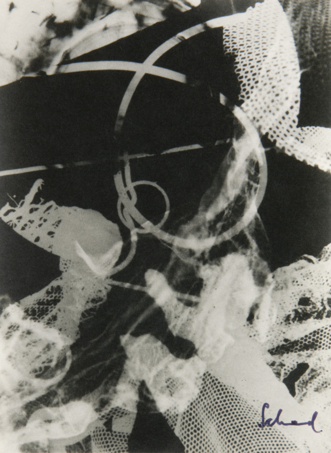 Schadographie 24b. 1960. Silbergelatine Abzug. 15,6 x 11,5 cm. Im unteren Bildbereich in Filzstift signiert (von Bettina Schad). Verso in Bleistift von Bettina Schad signiert und beschriftet: "Schadographie 24 b 1960, Originalfoto Bettina Schad".