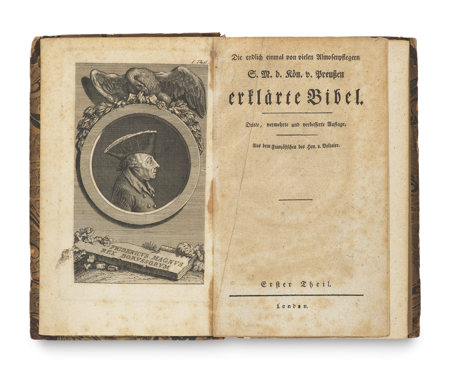 Die endlich einmal von vielen Almosenpflegern S. M. d. Kön. v. Preußen erklärte Bibel. Aus dem Französischen des Hrn. v. Voltaire. Dritte, vermehrte und verbesserte Auflage. 2 Tle. in 1 Bd. Mit 2 gestochenen Frontispizen. London (d.i. Wien, Mößle, 1787). 4 Bll., 296, 280 S. 8°. HLdr. d. Zt. mit Rückenvergoldung und Kleisterpapierbezug (etwas berieben und bestoßen).