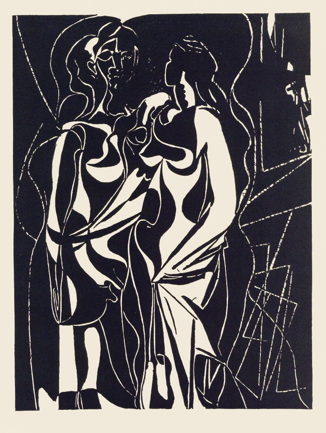 Hélène chez Archimède. Mit 22 (20 blattgr.) Orig.-Holzschnitten (gestoch. von Georges Aubert) nach Originalzeichnungen von Pablo Picasso. 198 S. Paris, Nouveaa Cercle Parisien du Livre, 1955. Folio. Lose Bögen in OUmschlag, in OPp.-Decke und OPp.-Schuber.