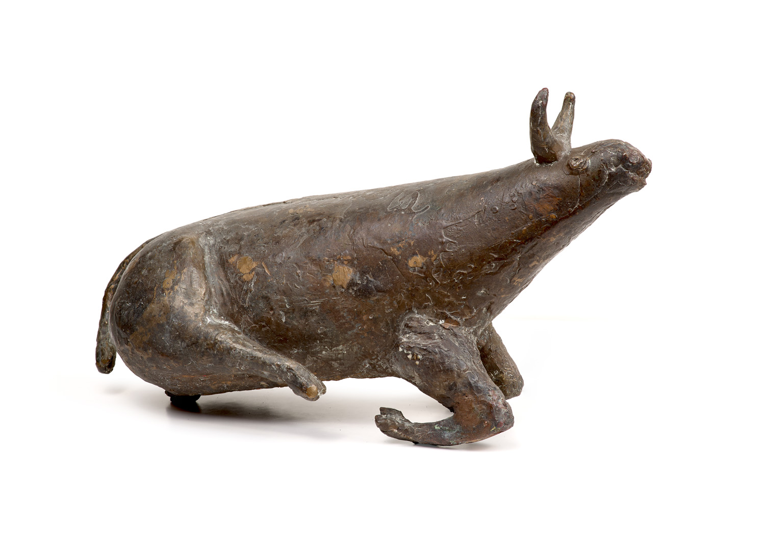Kuh. 1970. Hohlbronze mit goldbrauner Patina. Ca. 24 x 43 x 16 cm. Gestempelt "O" und "HK" am rechten Vorderbein. - Die Patina partiell etw. unregelmäßig, in den Vertiefungen mit leichter Anstaubung sowie etw. oxidiert, punktuell mit leichter Bereibung sowie vereinzelt mit Anschmutzung. Insgesamt gut. Hervorragender Guss mit ausdrucksstarker Oberflächenmodellierung.