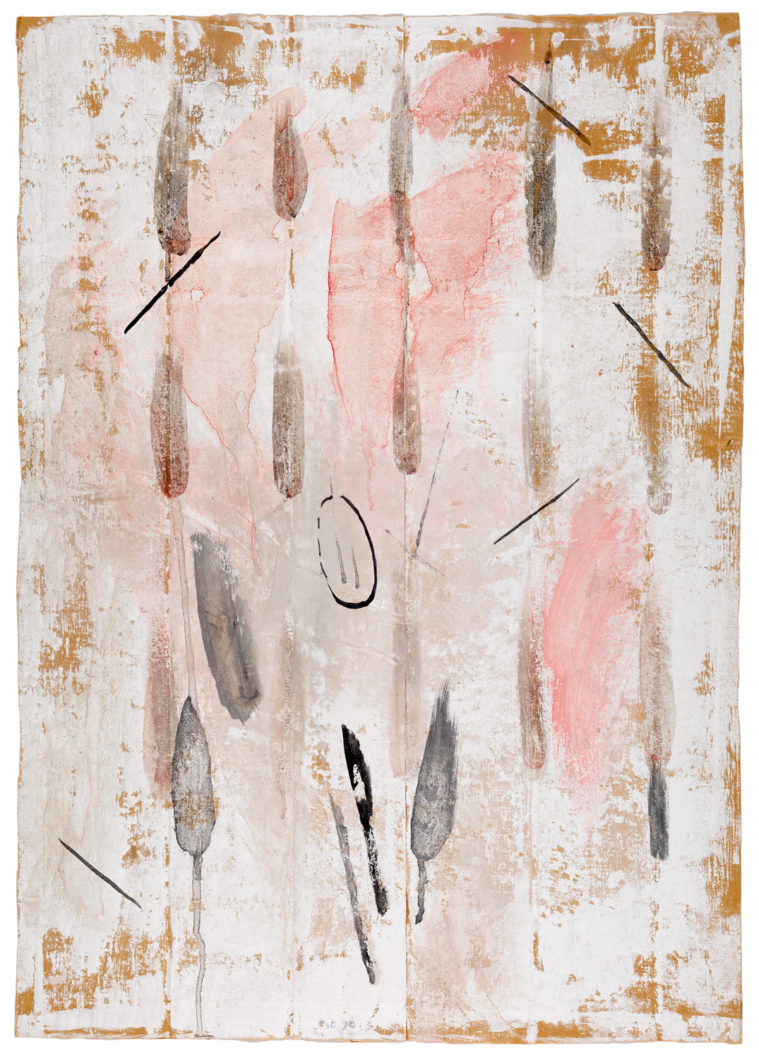 Online - Moderne und zeitgenössische Kunst – Privatsammlung, Wilhelmshaven. - Erika Stürmer-Alex' künstlerische Praxis ist von einem bewussten Umgang mit Material, Zeichensystemen und gesellschaftlicher Reflexion geprägt. Ihre Arbeiten entstehen häufig aus der Kombination unkonventioneller Bildträger und hybrider Techniken, die sie als kritische Erweiterung des künstlerischen Denkraums versteht. In der 1990 entstandenen Arbeit auf Packpapier zeigt sich dieses Prinzip in konzentrierter Form: Die fragile, gebrauchsnahe Materialität des Packpapiers wird bewusst einbezogen, um der Arbeit eine offene, vorläufige Struktur zu verleihen. Stürmer-Alex nutzt Mischtechnik - Zeichnung, Farbauftrag, Spuren, Überlagerungen - als visuelles Vokabular, das zwischen individueller Handschrift und kulturellem Gedächtnis oszilliert.