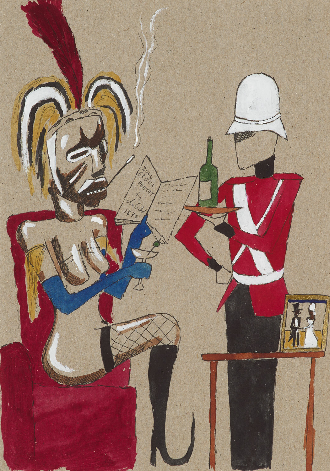 Online - Modern and Contemporary Art – Gouache and fine liner on wove paper. Signed, dated and with personal dedication on the inside of the sheet. Mounted on support and framed behind glass. Sheet slightly wavy due to the technique. Overall very good, the colour fresh and intense. - In Zulu Erotic Poetry, Andrew Gilbert combines colonial power relations with erotic projections and exposes the cultural attributions that are inscribed in the view of the "foreign". The work confronts the viewer with the entanglement of sexualisation and ethnographic masquerade, whereby cultural difference appears simultaneously fetishised and emptied. The militarised context refers to asymmetrical power structures in which the production of desire and dominance are inextricably linked.