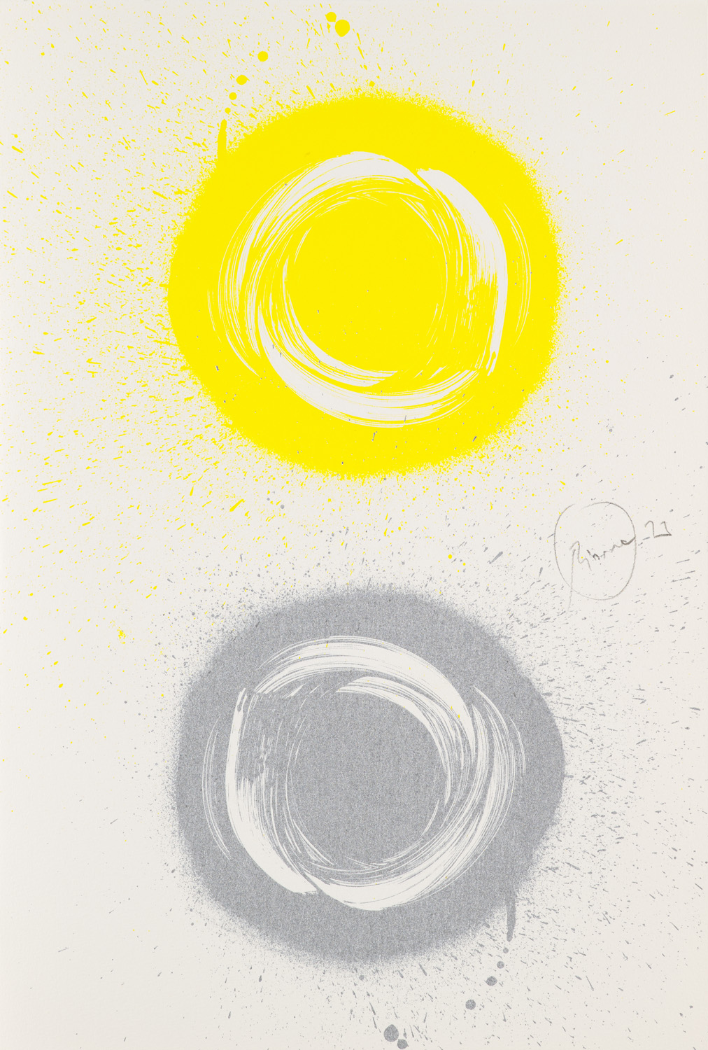 ZERO – gelb, silber, weiß. From: Insel - Ile - Island. 1973. Color silkscreen on strong wove paper. Signed and dated. - Very well preserved. Splendid and rich impression in exceptionally luminous colours of the full format depiction. - One of 100 copies which were numbered in the imprint. - XIV. Hundertdruck. - Published by Guido Hildebrand Verlag, Duisburg. - Printed by Margreff-Druck, Essen.