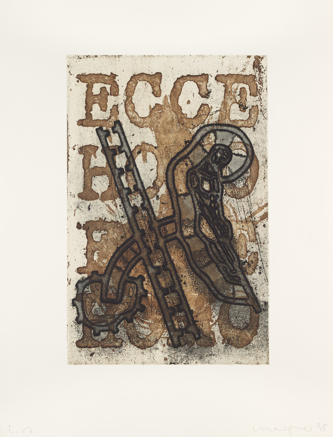2 Arbeiten. Ecce Homo. 1995. Je Radierung (stufenweise Ätzung, Aussprengverfahren) auf Hahnemühle Velin (mit Wz.). Blattmaße 70,5 x 54 cm und 70,5 x 52 cm. Je signiert, datiert und bezeichnet "E.A." - Insgesamt sehr gut. Prachtvolle, kräftige und nuancierte Drucke je mit Rand.