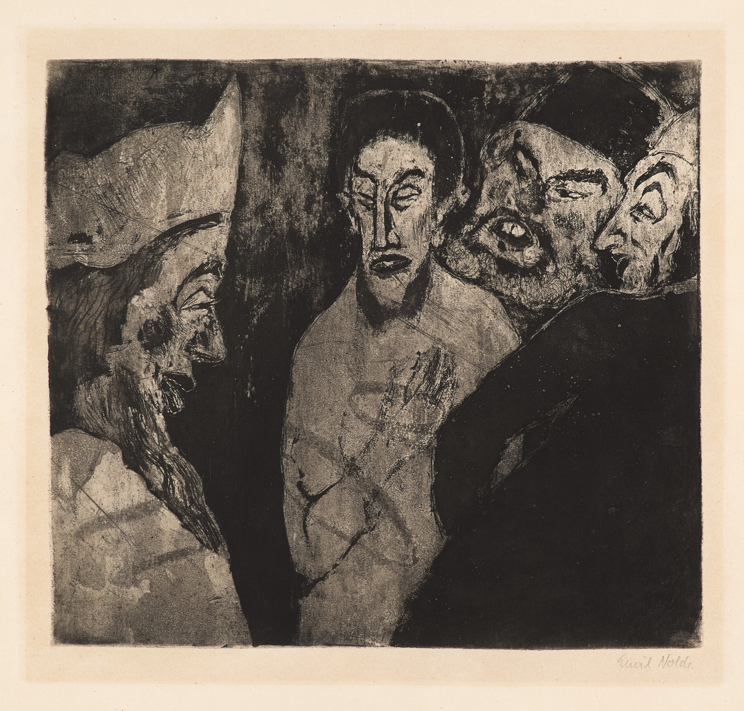 Schriftgelehrte. 1911. Strich- und Tonätzung von der Kupferplatte auf Van Gelder Zonen Bütten (mit Wz.). 26,7 x 30 cm (60 x 44,4 cm). Signiert, mittig im unteren Rand in Bleistift von Ada Nolde betitelt "Schriftgelehrte". In Punkten auf Unterlage montiert, unter Passepartout und Glas gerahmt. - Papier mit zarter Anbräunung (etw. stärker im Passepartoutausschnitt), vereinzelt mit blassbraunen Fleckchen, im rechten Rand zwei restaurierte Einrisse sowie mit kleinen Läsuren, partiell minimal fleckig, vereinzelt mit Anmerkungen in Bleistift (diese teils ausradiert), im oberen Rand im Bereich der Montierung mit leichter Verfärbung. Insgesamt sehr gut. Prachtvoller Druck mit filigraner Strich- und differenzierter Tonätzung, mit breitem Rand. Sehr selten.