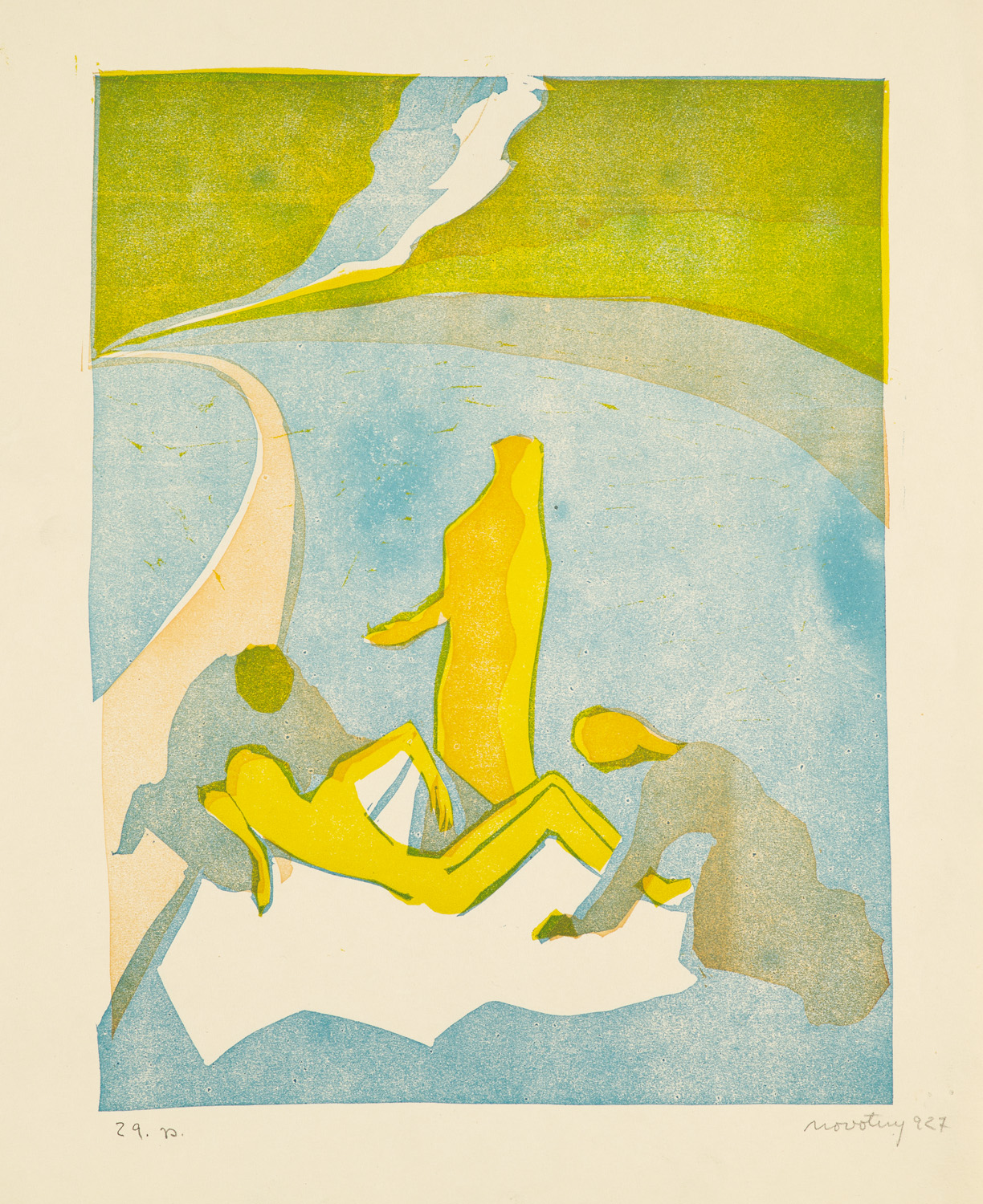 Classical Modernism – Hungary. - 9 Linocuts, each signed by artist. First edition. In original portfolio with mounted signed Linocut (Slightly bumped). - Partly very slightly stained at the edges. In good condition. - Portfolio of avant-garde linocuts by the Hungarian painter and graphic artist, Emil Róbert Novotny. 7 colour and 2 black-and-white linocut plates, each signed and dated by the artist in pencil. - Emil Róbert Novotny (1898-1975) is associated with the circles of modern artists in Nagybánya, the cradle of modern Hungarian painting. A few compositions were supplemented by Novotny with acrylic paint.