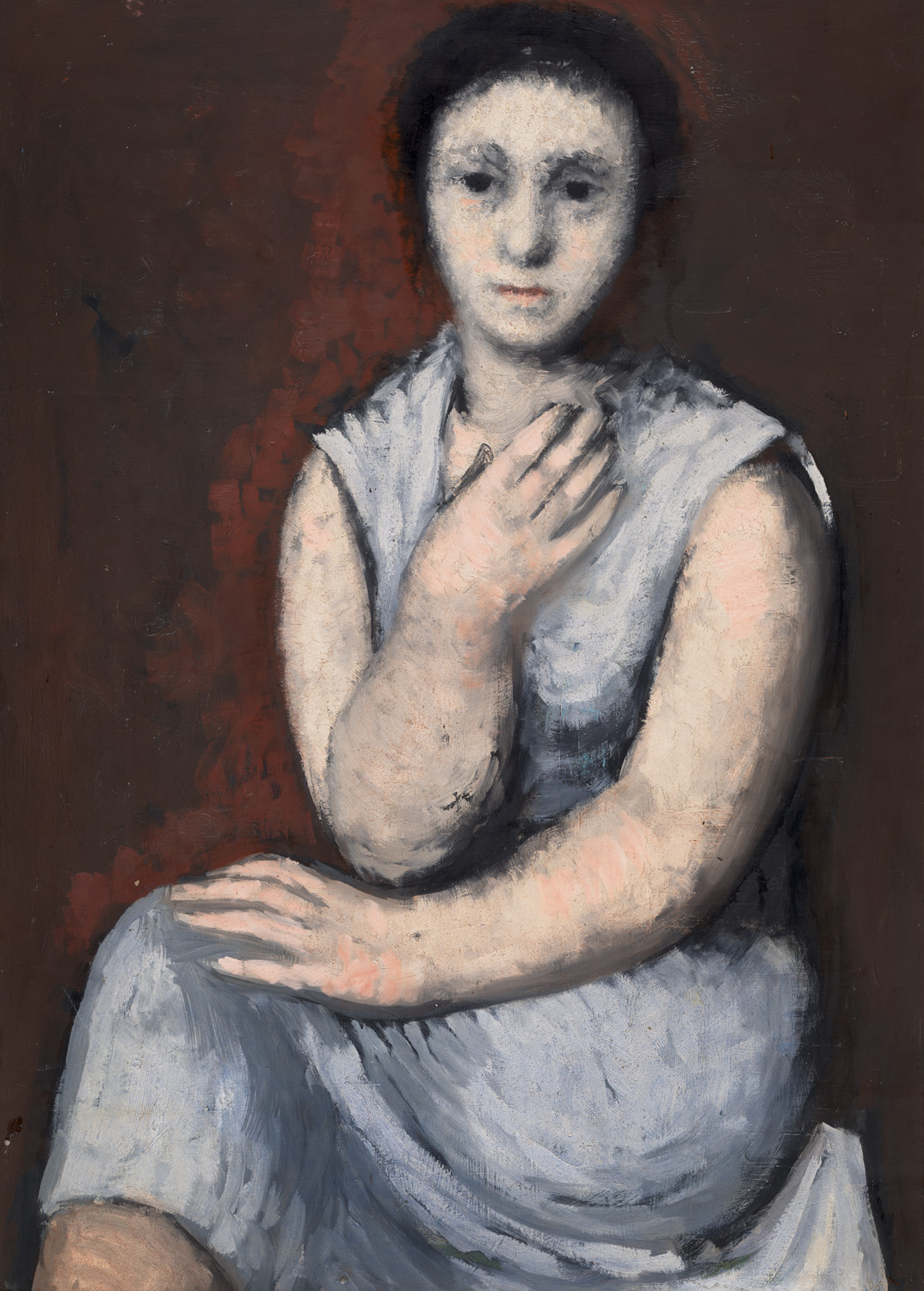 o.T. (Frauenporträt). Mischtechnik mit Öl auf Hartfaserplatte. 98,5 x 69 cm. Im Rahmen montiert (103,5 x 84 cm). - Leichte Krakelee Spuren. Winzige Löcher in den Ecken, vermutlich von einer früheren Montierung. Punktuelle, leichte Oberflächenbereibung. Insgesamt sehr gut. FOrachtvolles Werk mit zarter Farbgebung.