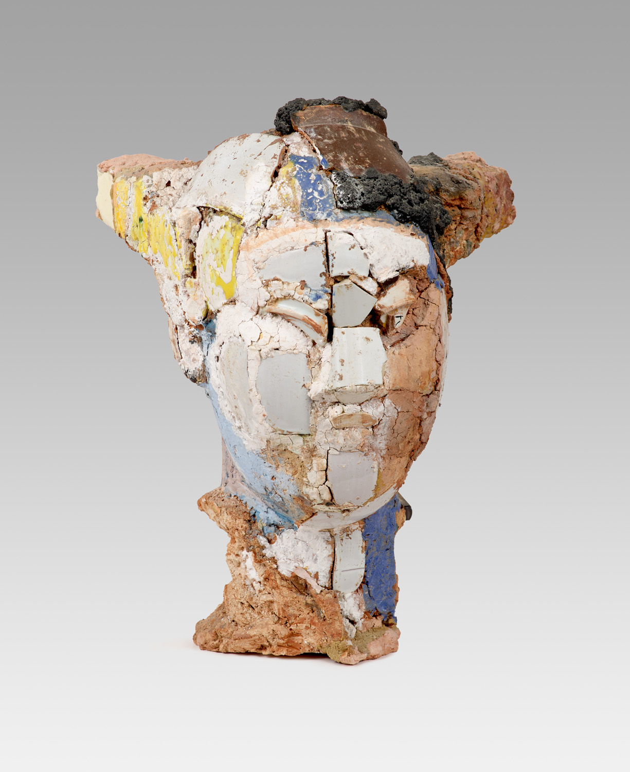 Kopf. Um 1990. Schamottierter Ton, Glasuren und Engoben. 40 x 30 x 26 cm. Monogrammiert. - Partiell mit kleinen, kaum merklichen Abplatzungen. Insgesamt sehr gut.