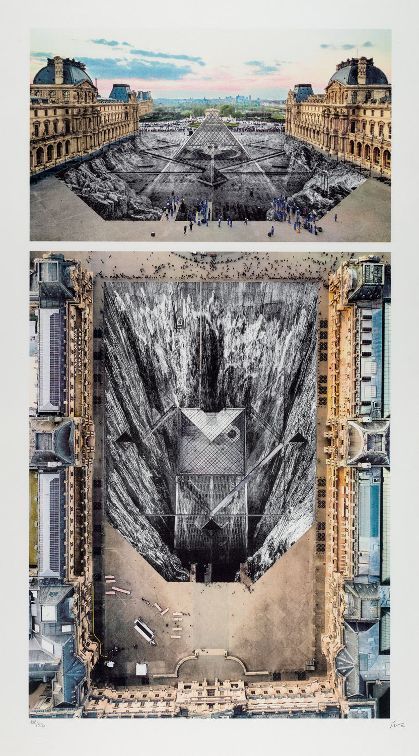 Zeitgenössische Kunst – Eines von 250 Exemplaren. - Druck bei idem paris, mit deren Prägestempel. - JR wird erstmals 2016 eingeladen, eine künstlerische Intervention am Louvre zu gestalten. Die ikonische Pyramide von Ieoh Ming Pei, berühmtes Symbol des Museums, verhüllt er unter einer anamorphotischen Collage und bringt sie zum optischen Verschwinden. Die unzähligen Pariser und Parisbesucher werden dazu aufgefordert, sich herumzubewegen, die Pyramide zu finden, das Trompe l'oeil des Künstlers aufzudecken, und letztlich über das städtebauliche Ensemble nachzudenken. Drei Jahre später, im Jahr 2019, realisiert JR erneut eine überdimensional große Collage, nun mit Hilfe von 400 Freiwilligen. Sie schneiden, legen und rollen tagtäglich unzählige Papierstreifen auf dem Museumsplatz auf und verwandeln den Cour Napoléon in eine begeh- und wandelbare Installation. Qua Partizipation rücken Themen wie Anwesenheit, Abwesenheit, Realität und Erinnerung in den Vordergrund.