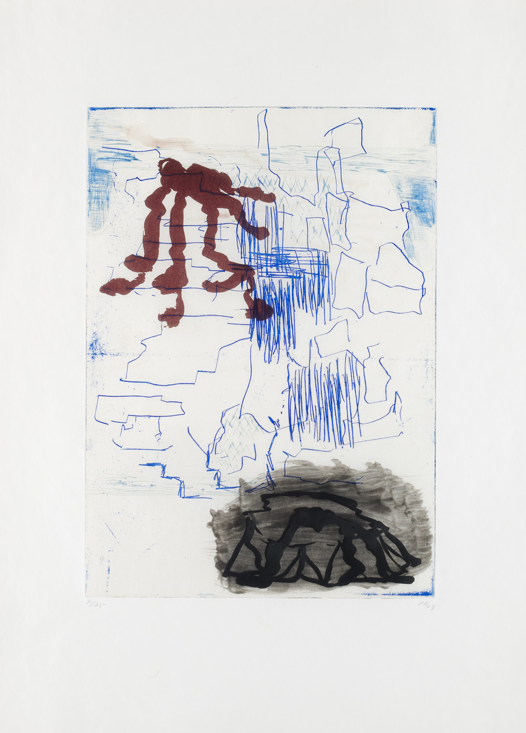 o.T., aus: 9 Color Etchings. 2003. Kaltnadel, Zuckertusche-Aquatinta und Zuckerreservage auf hauchdünnem Japanbütten. 41,8 x 29,8 cm (64 x 49,5 cm). Monogrammiert, datiert und nummeriert. Punktuell auf Unterlage montiert und hochwertig unter Glas gerahmt (ungeöffnet). - Obne mittig punktueller, blassbrauner Fleck, ganz punktuell leichte Griffspur, insgesamt augenscheinlich sehr gut. Prachtvoller, herrlich gratiger und stellenweise malerisch anmutender Druck mit deutlich eingeprägter Plattenkante und breitem Rand, links mit dem Schöpfrand.