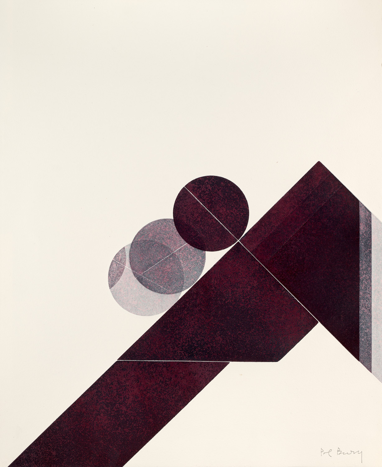 Geometrische Abstraktion - Op Art – Bury trägt hier eine minimalistisch-abstrakte Figuration aus geometrischer Formen in Bordeauxrot mit Sprenkeln in Rot- und Brauntönen vor, die vor allem aus Kreisen und schrägen, rechtwinkeligen Linien besteht. Durch die Transparenz und Überschneidung der Kreise entsteht eine räumliche Wirkung und Dynamik, die für Pol Bury typisch ist. Die Aquatinta-Technik verleiht den Flächen eine besondere Tiefe und Textur, wodurch die gezeigten Formen lebendig und vielschichtig wirken.