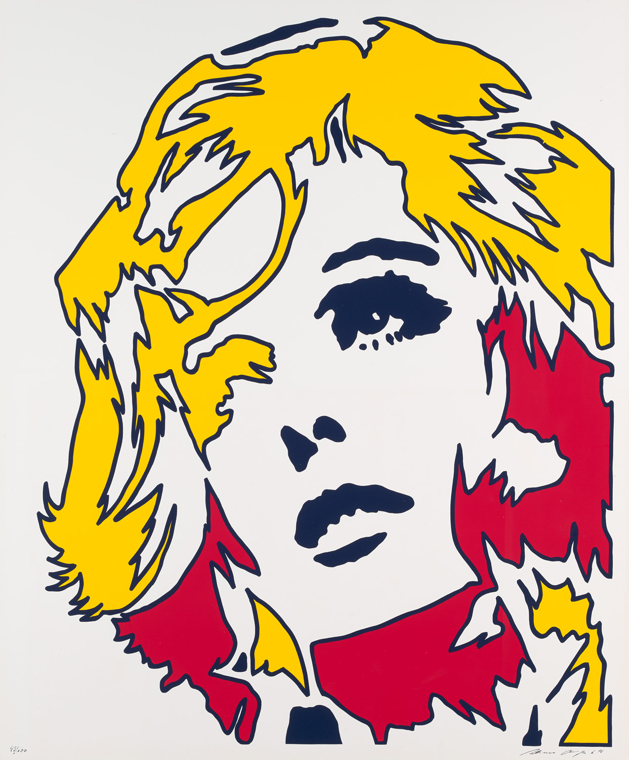 Pop Art – Colour serigraph on polyester foil. Signed, dated and numbered. - Verso with partial rubbing. Very good overall. Splendid impression, the colours fresh and intense. - Lechleiter G 1969.1. - One of 100 copies. - Ed. Industriemesse-Gesellschaft, Berlin 1969. - In the present composition, Werner Berges once again focuses his visual interest on the female figure as a sign and pictorial object. Using clear contours and rich colour areas, he transforms the depiction into a portrait with influences from advertising and media aesthetics. The choice of polyester film as an unusual printing support material gives the work a smooth, technical-looking surface and emphasises the industrial character of Pop Art.