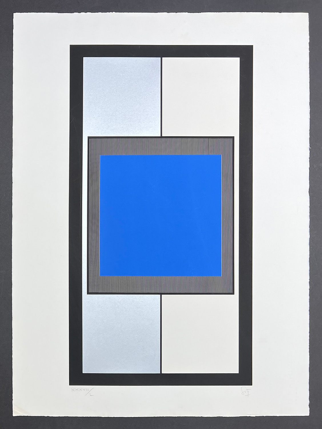 Cuadrado cobalto. 1975. Farbserigraphie auf Vélin. 64,5 x 34,8 cm (76,5 x 56,2 cm). Signiert und nummeriert. Prachtvoller und kontrastreicher Druck in Blau, Silber und Schwarz mit Rand, an zwei Seiten mit dem Schöpfrand.