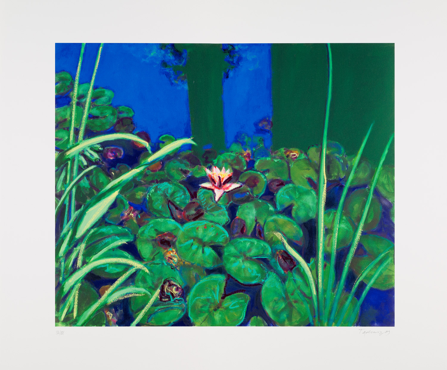 Seerosen und Gräser. 2009. Digitaler Pigmentdruck, partiell in Ölfarbe übermalt, auf kräftigem, leicht strukturiertem Velin. 54,8 x 66 cm (73 x 87,8 cm). Signiert, datiert und nummeriert. - Leichte Griffspur am rechten Rand mittig, Ecken tls, sehr leicht bestoßen, insgesamt sehr gut. Prachtvoller, farbleuchtender und satter Druck mit breitem Rand.