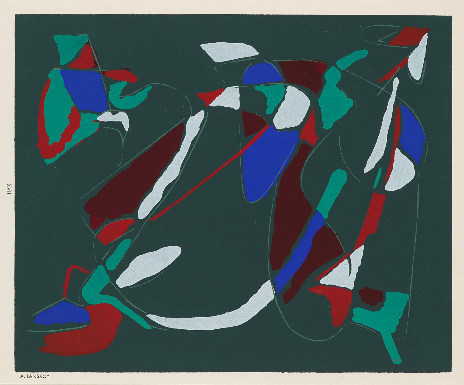 o.T. (abstrakte Komposition). 1952. Pochoir auf Velin. 18 x 21,9 cm (19,8 x 24 cm). Typographisch unterhalb der Darstellung bezeichnet und mit römischer Nummernfolge. - Punktuell leichte Oberflächenbereibungen, verso leichte Farbspuren, insgesamt gut. Prachtvoller, farbkräftiger Druck mit schmalem Rand.