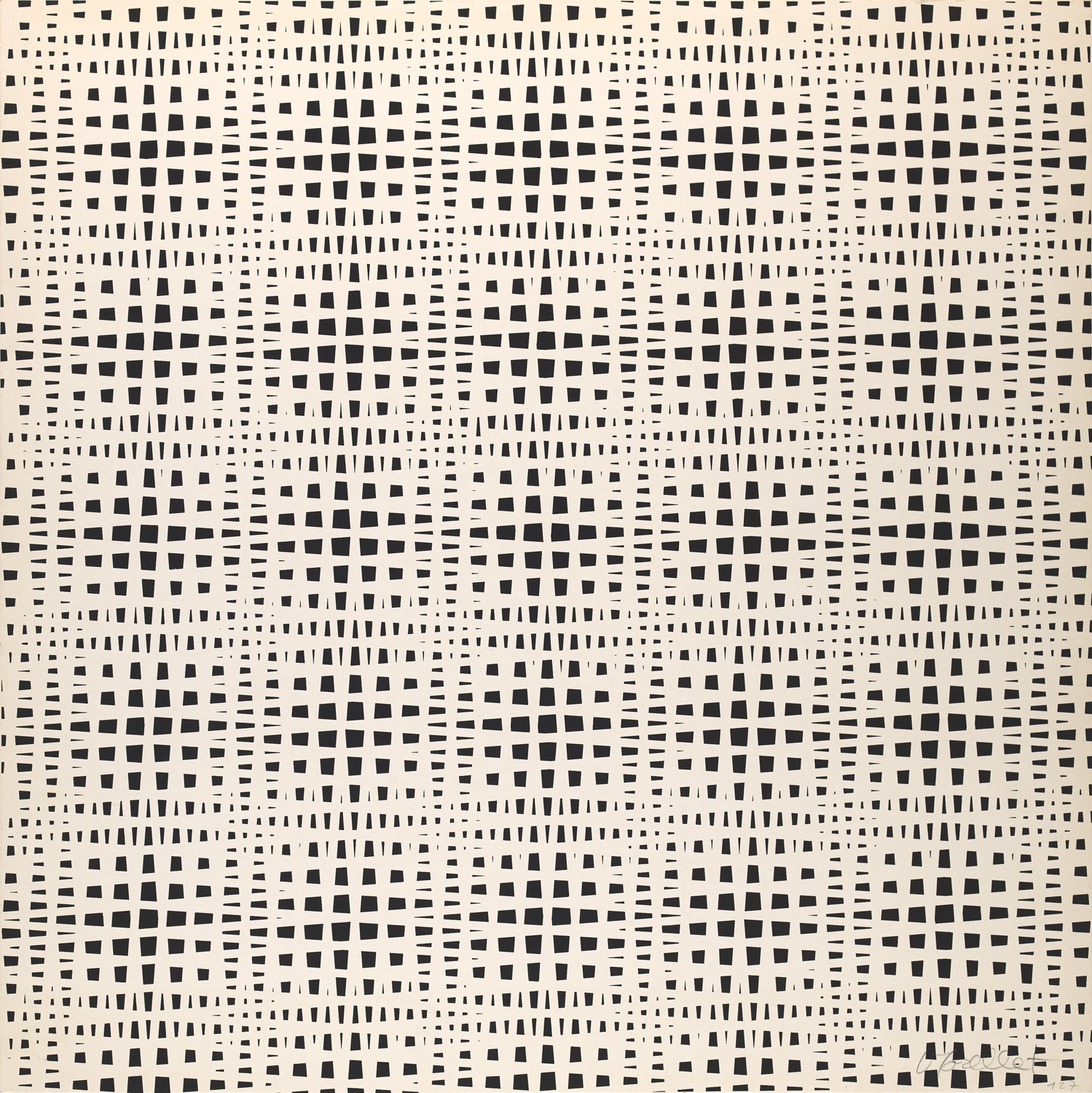 o.T. 1971. Serigraphie auf festem Vélin. 61 x 61 cm. In Bleistift signiert. - In den Rändern leicht gebräunt und sehr vereinzelt mit kaum merklichen Braunfleckchen. Obere Blattkante mit kleiner Delle. Unterhalb der Signatur und verso mit Annotation in Bleistift. - Ausgzeichneter Druck der verspielt-geometrischen Komposition mit kinetischer Wirkung.