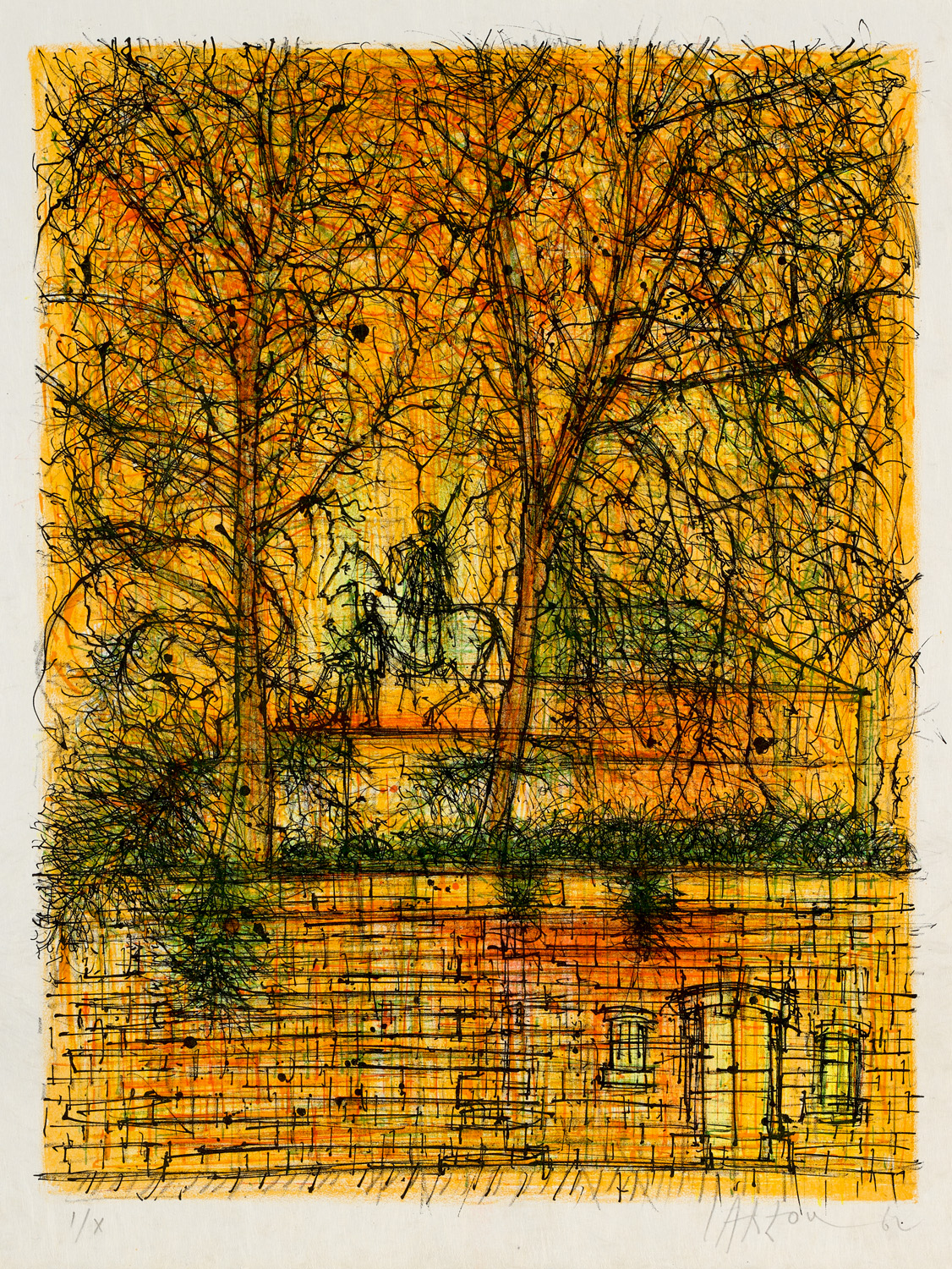 (I. Les Tuileries. II. La Maison dans les arbres. III. Homme à cheval). 1962. Signiert und nummeriert. Vier Arbeiten. Je Lithographie in Farbe auf Japon Nacré. 37,5 x 29 cm (43 x 33 cm) bis 39 x 59,9 cm (43,3 x 62,8cm). Je prachtvolle, satte und gratige Drucke mit Rand, mit dem Schöpfrand an der unteren und rechten Seite.