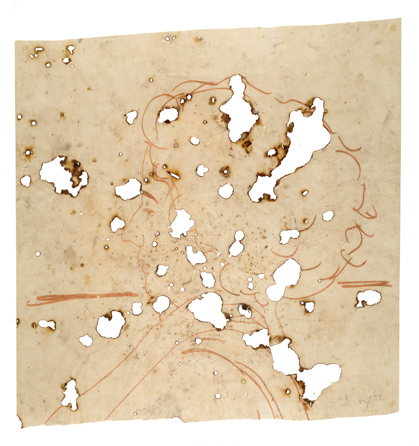 Elke. 1989. Filzstift auf Transparentpapier mit Feuerflecken. Ca. 93 x 90 cm Signiert. - Minimale Oberflächenbereibung. Verso mit Montagespuren in den Ecken, recto leicht sichtbar aufgrund des Papieres. Insgesamt sehr gut. Filigrane, prachtvolle Arbeit.
