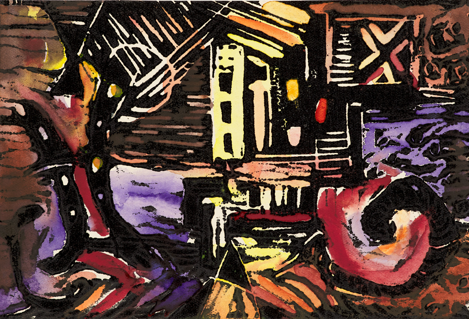 Interieur. 1960. kolorierter Holzschnitt. 10,5 x 15,5 cm. Verso signiert. Entlang der oberen Blattkante auf festem Velin montiert (29,5 x 22,5 cm ). - Minimale Bestoßung der Ecken. Insgesamt sehr gut. Prachtvoller Holzschnitt mit vibrierenden Farben.