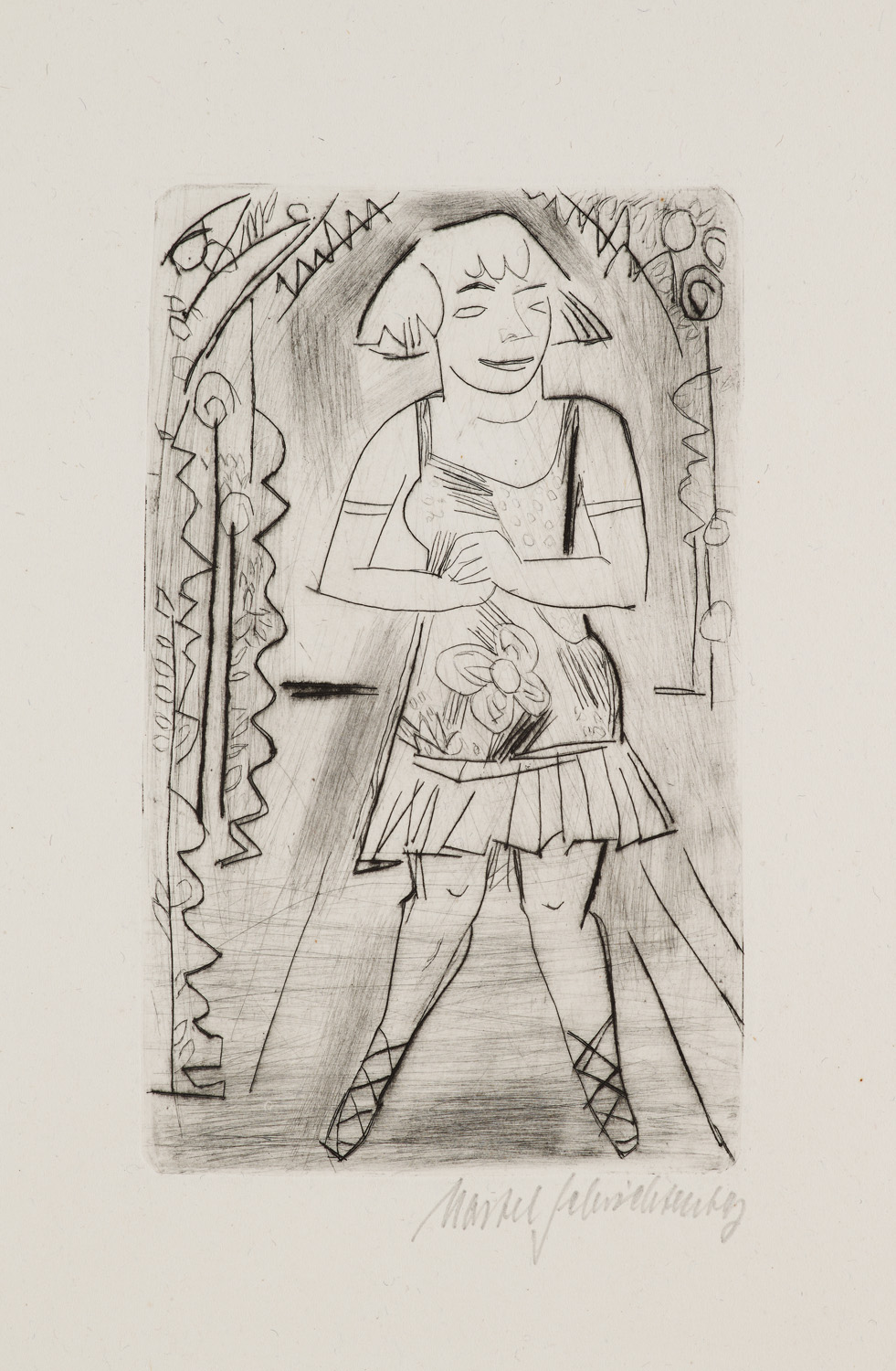 Varietésoubrette. 1922. Radierung auf Velin. 18,3 x 11 cm (41,5 x 30 cm). Signiert. - Im Blattrand punktuell mit blassbraunen Fleckchen, die Kanten etwas unfrisch. Insgesamt sehr gut. Prachtvoller, gratig anmutender und kräftiger Druck mit breitem Rand.
