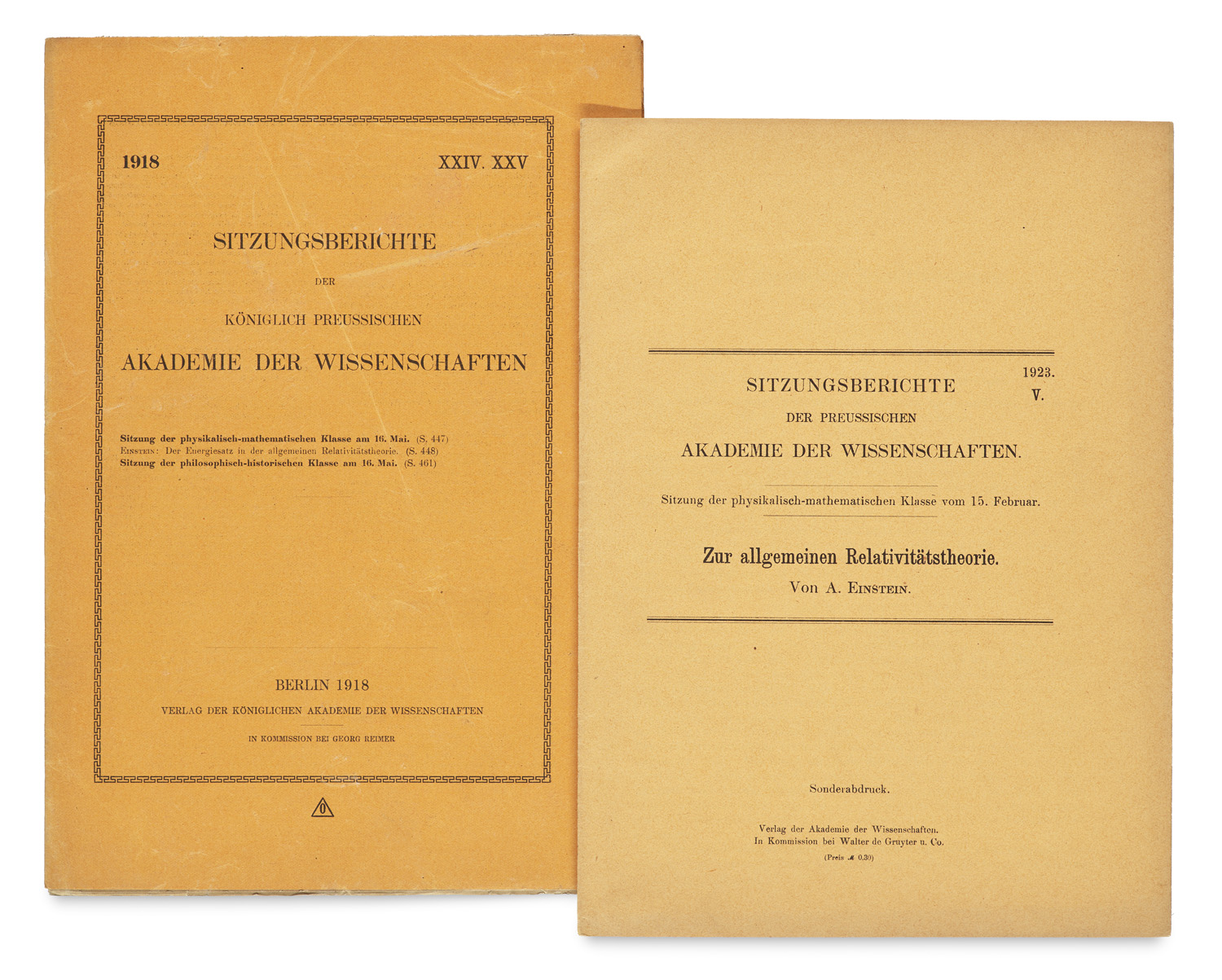 Der Energiesatz in der allgemeinen Relativitätstheorie. Erster Separatdruck. Und: Zur allgemeinen Relativitätstheorie. Erster Sonderabdruck. (= Sitzungsberichte der (Königlich) Preussischen Akademie der Wissenschaften, XXIV (1918) und V (1923). Sitzungen der physikalisch-mathematischen Klasse am 16. Mai 1918 und 15. Februar 1923.) Berlin: Verlag der (Königlichen) Akademie der Wissenschaften, Komm. Reimer (Reichsdruckerei), 30. Mai 1918 und 12. März 1923, Ss. 32-38 (1) und Ss. 449-461 (1). Gr.-8°. OBr. mit Umschl.tit. (ein Umschl. mit Knickspuren und leicht angeschmutzt).