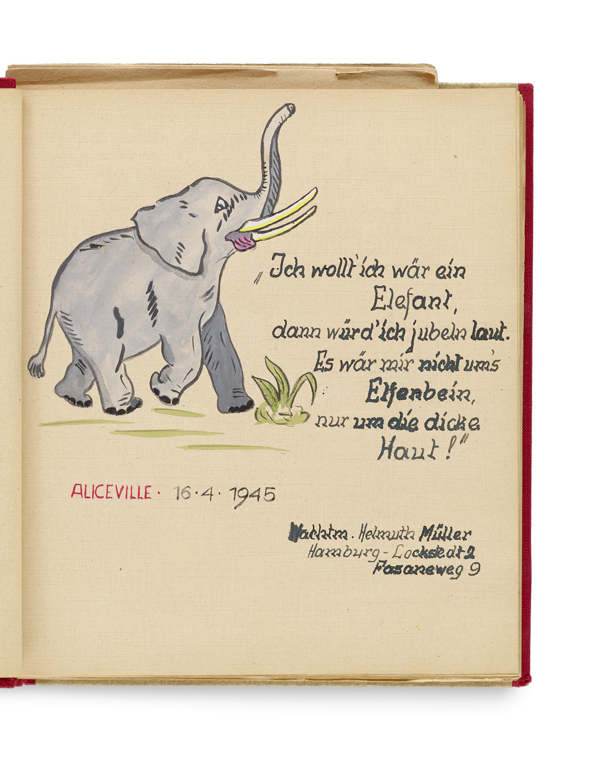 Manuscripts – POW - World War II - Album belonging to Sergeant Major Georg Nordmann with 55 handwritten entries by German prisoners of war in the Aliceville camp (Alabama) and Fort Indiantown Gap (Pennsylvania) (3). With a coloured map and three coloured drawings. Contemp. half cloth. - With entries by, among others: as listed above. - Inside cover stamped with 'Army Service Forces' and certified ownership note for Georg Nordmann. - With dedication 'in grateful recognition for the work done in the service of the community' (transl.)(Christmas 1944) by Captain Walter Stullmann(?) (Quedlinburg) and dedication sheet from the Presidium of the German Red Cross. - The double-sided map shows 'Our route to the U.S.A. via: England (Scotland) - New York, through the states of Pennsylvania, Ohio, Kentucky, Tennessee, Alabama (Aliceville)' (transl). - 3 sheets of handwritten notes enclosed. - Browned due to the paper, overall in good condition.