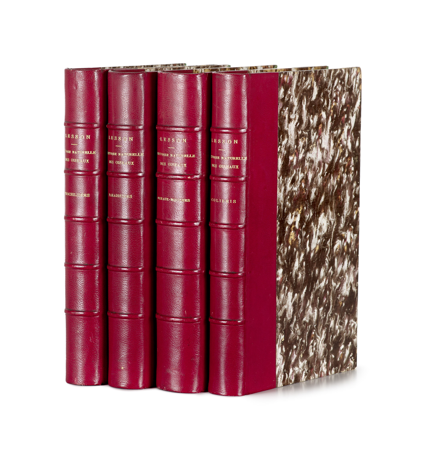 Histoire naturelle des oiseaux-mouches. - Histoire naturelle des colibris, suivie d' un supplé-ment a l'histoire naturelle des oiseaux mouches. - Les trochilidées ou les colibris et les oiseaux- mouches. - Histoire naturelle des oiseaux de paradis et des épimaques. 4 Bde. - Paris, Arthus Bertrand, 1829-1835. Rote Ziegenhldr. d. Zt. mit RVergoldung.
