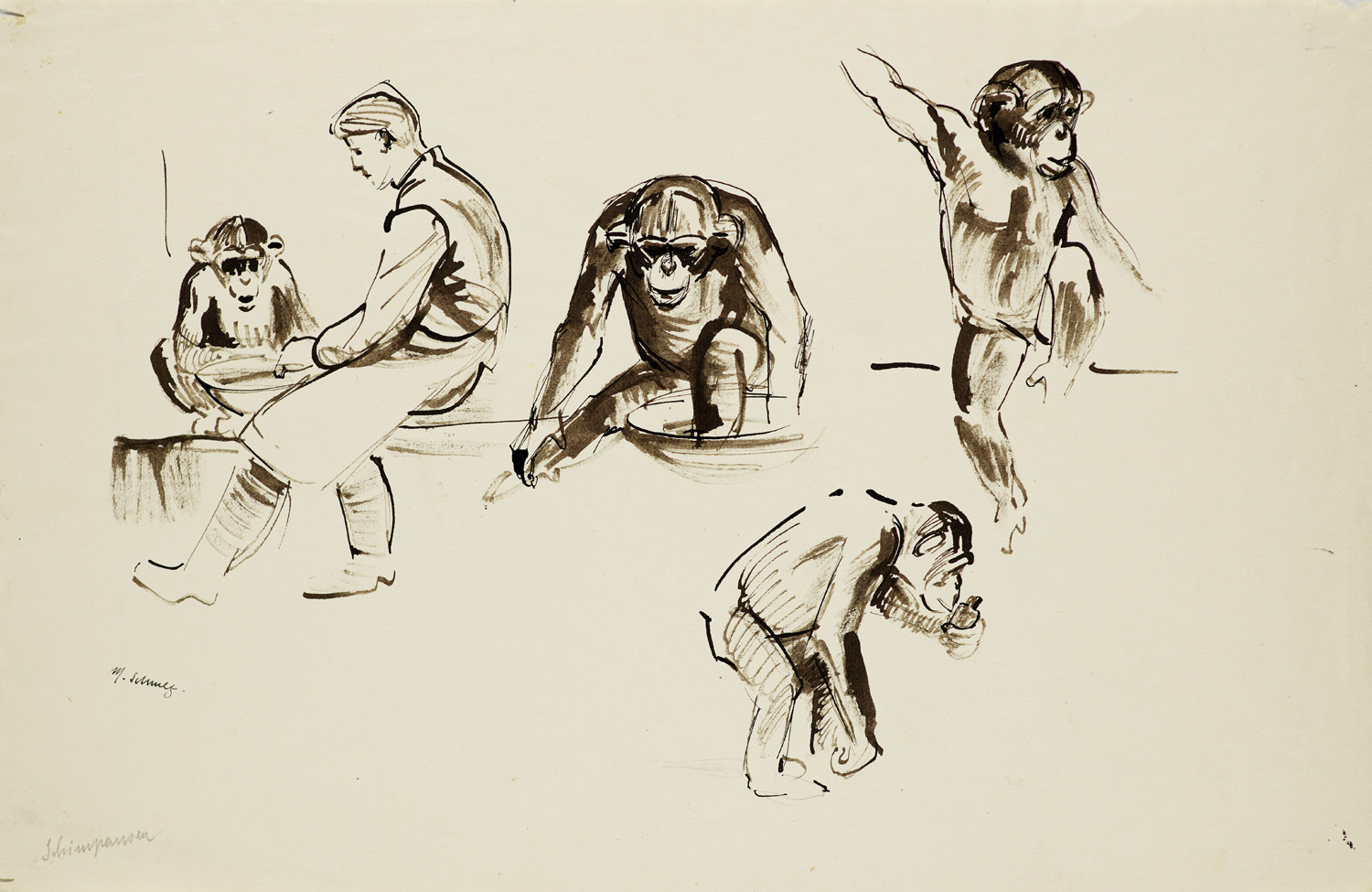 5 Arbeiten. Zoologische Zeichnungen. Schimpanse, Gibbon, Makake, Viktoriataube, Nashornvogel und Schildkröte. Tinte auf Bütten oder Velin (2 Bl. m. Hahnemühle-Wz.). Blattmaß bis 50 x 34 cm. Je signiert. - Je wenige kleine, punktuelle Braunflecken, Papier leicht gegilbt, dezente Knickspuren und Einrisse, sowie Ränder leicht gebräunt. Verso punktuell Spuren ehemaliger Montierung. Insgesamt gut.