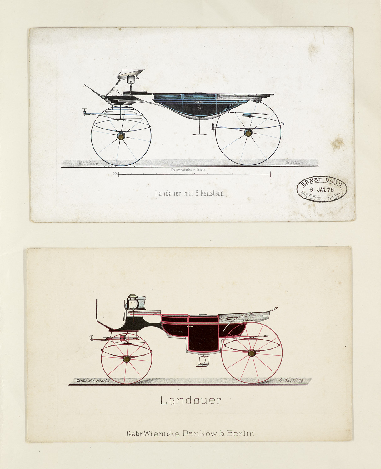Technik – Kutschwagenbauanstalt Gebrüder Wienicke Pankow. 10 Exemplare gestempelt "Ernst Damm, Wagenfabrik Dresden", jeweils mit Modellnamen bezeichnet.