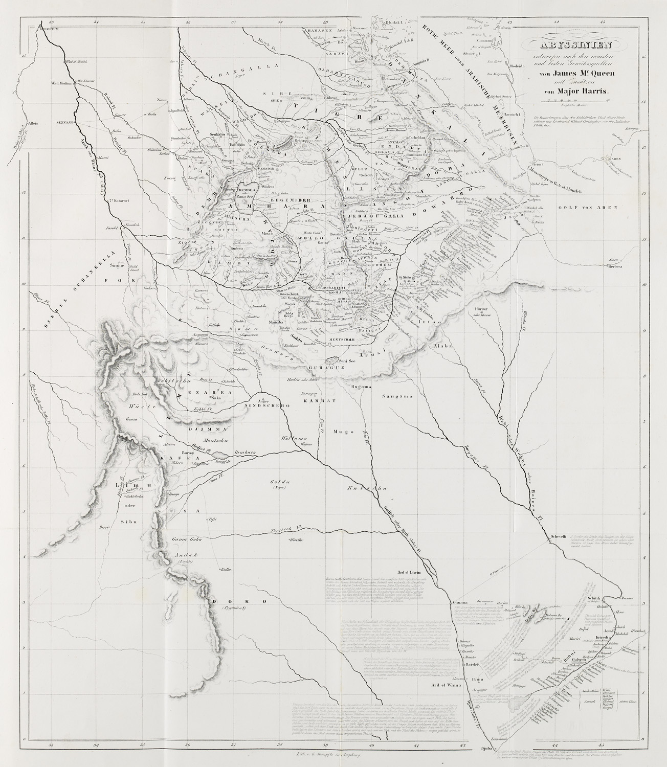 Gesandtschaftsreise nach Schoa und Aufenthalt in Südabyssinien 1841-1843. Deutsch von K. v. K. (= Reisen u. Länderbeschreibungen der älteren und neuesten Zeit, 30. und 32. Lieferung.) 1. u. 2. Abt. 2 Bde. Mit einer mehrfach gefalt. lithogr. Karte. Stuttgart u. Tübingen, Cotta, 1845/1846. 8°. OBrosch. (Papier an den Gelenken tls. gerissen, etw. bestoßen, ein Rückdeckel fleckig).