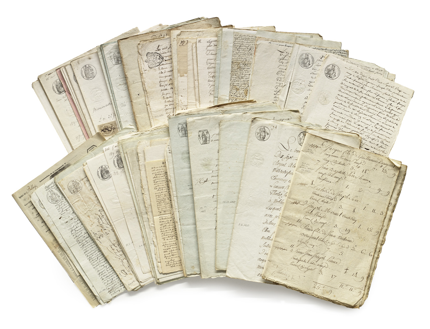 Sammlung von ca. 93 französischen Verträgen und Notariatsdokumenten u.a. Pierre Joseph Clere (Clair/Clerc) "de nobleur" in Bourg betreffend. Um 1777-1850. Versch. Formate von ca. 26 x 18 bis 30 x 21 cm. Meist auf Bütten mit Wz.