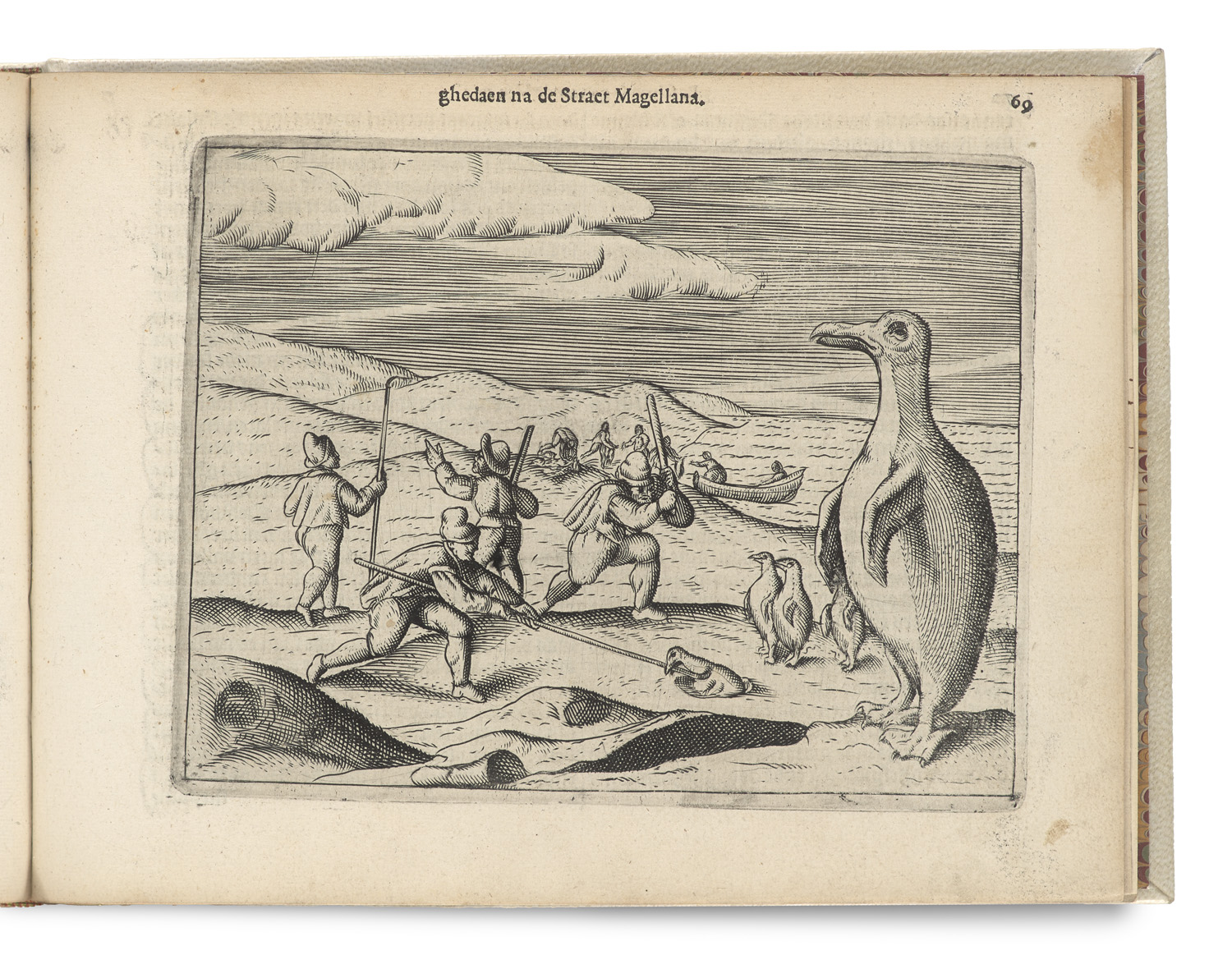 Geography and Travel – South America. - With engraved title vignette (celestial globe) and 8 full-paged etchings as well as 1 further wood-cut vign. - Second imprint, with new, improved set of etchings, of this important Dutch travelogue about a crossing of the Strait of Magellan by De Weert in 1598/99. - Sabin, J. Dictionary of books relating to America from its discovery to the present time, vol. XV, 64582 - Tiele, P.A. Mémoire bibliographique sur les journaux des navigateurs néerlandais ..., pp. 24-26 - Detailed and richly illustrated account of a Dutch expedition with five ships to cross the Strait of Magellan, here the second imprint of first edition published in 1600. In the course of this expedition, two ships were separated from the fleet during a storm and had to remain four months in the strait, during which Captain De Weert and the crews had to endure a variety of 'dangers and sufferings' (Tiele, p. 24). - "Les planches sont des imitations beaucoup plus exactes que celles qui se trouvent dans la colleétion des De Bry." (Tiele, S. 25) - Wrong pagination: 43 instead of 34, 60 and 61 reversed, 72 missing, 77 instead of 73, 27 instead of 76 and 73 instead of 77 - Top edge trimmed closer, but without loss of text, the last 5 leaves slightly stained at the upper fore-edge, some older marginalia in pencil, paper with slight browning. Overall a well-preserved copy of this very rare edition. - Of particular rarity, only two copies traceable for us at auctions in the last few years.