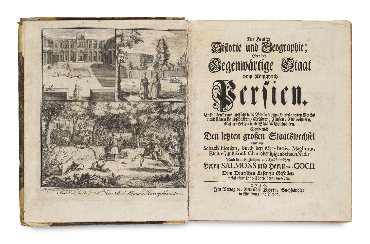 Geographie und Reisen – Enthält: 1. Die heutige Historie oder der gegenwärtige Staat vom Königreich Persien. Mit gestoch. Frontispiz und gefalt. Kupferkarte. Flensburg u. Altona, Korte, 1739. - 2. Die heutige Historie ... von Arabien und der Großen Tartarey. Mit gest. Frontisp. u. gefalt. Karte. Ebenda 1747. - 3. Die heutigie Historie ... des Türkischen Reichs. 1. Teil. Mit gest. Frontisp. u. Karte. Ebenda 1848. - 4. Die heutige Historie ... der Europäischen Türkey 2. T. Mit gest. Frontispiz. Ebenda 1749. Mit Anhang (mit eig. Pagin.) bestehend in einem kurzen Auszuig der Türkenkriege, welche vom 16. Jh. an bis auf diese unsere Zeiten, 1749, in Europa geführet worden. 4°. HPgt. d. Zt. (etw. bestossen). - Griep II, 1217 (Persien) - Lowndes IV, 2179: "This is Salmon's best work, and has been abridged, continued, and published under various fict. names". - Die Faltkarten zeigen das Persische Reich, die Tartarei und das Türkische Reich in Europa.