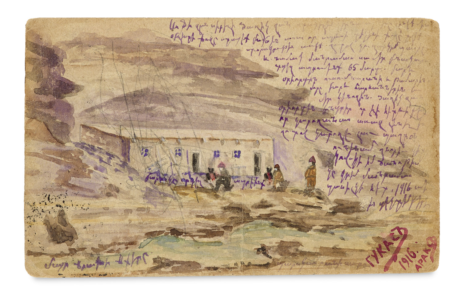 Geography and Travel – Collection of 22 colored pencil drawings from the Persian-Armenian-Azerbaijani border region. Pencil and watercolor on vellum. - The 19 drawings and 3 watercolors were drawn on the reverse side of mostly unused blank Russian postcards. The drawings are each signed "Gukas" in Cyrillic and dated between 1915 and 1917. The used postcard with presumably Armenian handwritten text. - Marginal damage, edges browned. Overall in good condition. - Also included: Portrait photograph on cardboard. - Cardboard and photograph with marginal damage. Cardboard stained. High-contrast, well-preserved photograph.