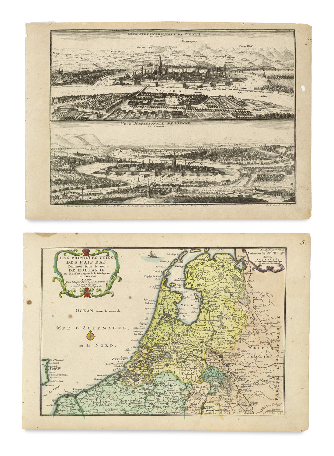 Geographie und Reisen – Enthält 14 kolorierte Landkarten und Pläne, u.a. von Bordeaux, Cours de Rhin (3), Schweiz, Landau, Lorraine, Paris et de Chaalons, Schwaben, Holland, Brisach, Ferraresse, Neuchatel sowie 16 (1 kol.) Stadtpläne, Grundrisse u.ä., u.a. Chateau du Louvre (kol.), Dom des Invalides, Kopenhagen, Menagerie de Versailles, Ulm, München, Wien u.a. - Teils leicht fleckig oder etwas gebräunt, etwas bestoßen.