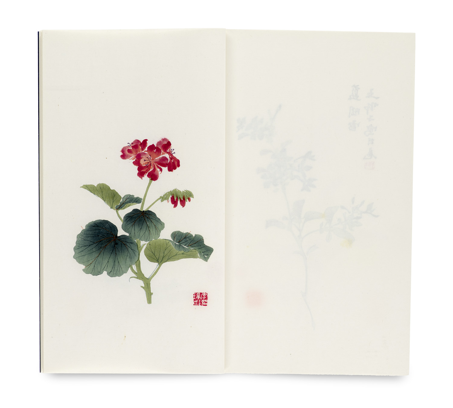 Geographie und Reisen – Reich illustrierte Sammlung chinesischer Briefpapiere des Tuschemeisters Qi Baishi. Die farbigen Holzschnitte wurden nach Aquarellen Qi Baishis und weiterer bedeutender Maler Chinas direkt von den Originalstöcken gedruckt. Sie zeigen Landschaften, Pflanzen, Vögel, Insekten und Fische und zählen dank der präzisen Naturbeobachtung des Künstlers zu den herausragenden Arbeiten ihrer Zeit. Sämtliche Blätter sind im Stock betitelt bzw. mit einem Gedicht versehen und jeweils mit rotem Signaturstempel ausgestattet. Qi Baishi (auch Ch'i Pai-shih, 1863-1957), ursprünglich als Holzbildhauer und Tischler ausgebildet, gilt als einer der bedeutendsten modernen Künstler Chinas und fand auch im Westen große Beachtung. Über Malvorlagenbücher gelangte er zur eigenen Malerei und entfernte sich, unter dem Einfluss der "impressionistischen" Xieyi-Schule der Song- und Ming-Zeit, von streng detaillierter Wiedergabe hin zu einer charakteristisch zarten, gelösten Bildsprache. Besonders berühmt sind seine außerordentlich scharf beobachteten Darstellungen von Fischen, Insekten, Vögeln und Blumen (Vollmer IV, 478). - Schönes, sauberes Exemplar. kräftige Abdrücke in insgesamt sehr gutem Zustand.