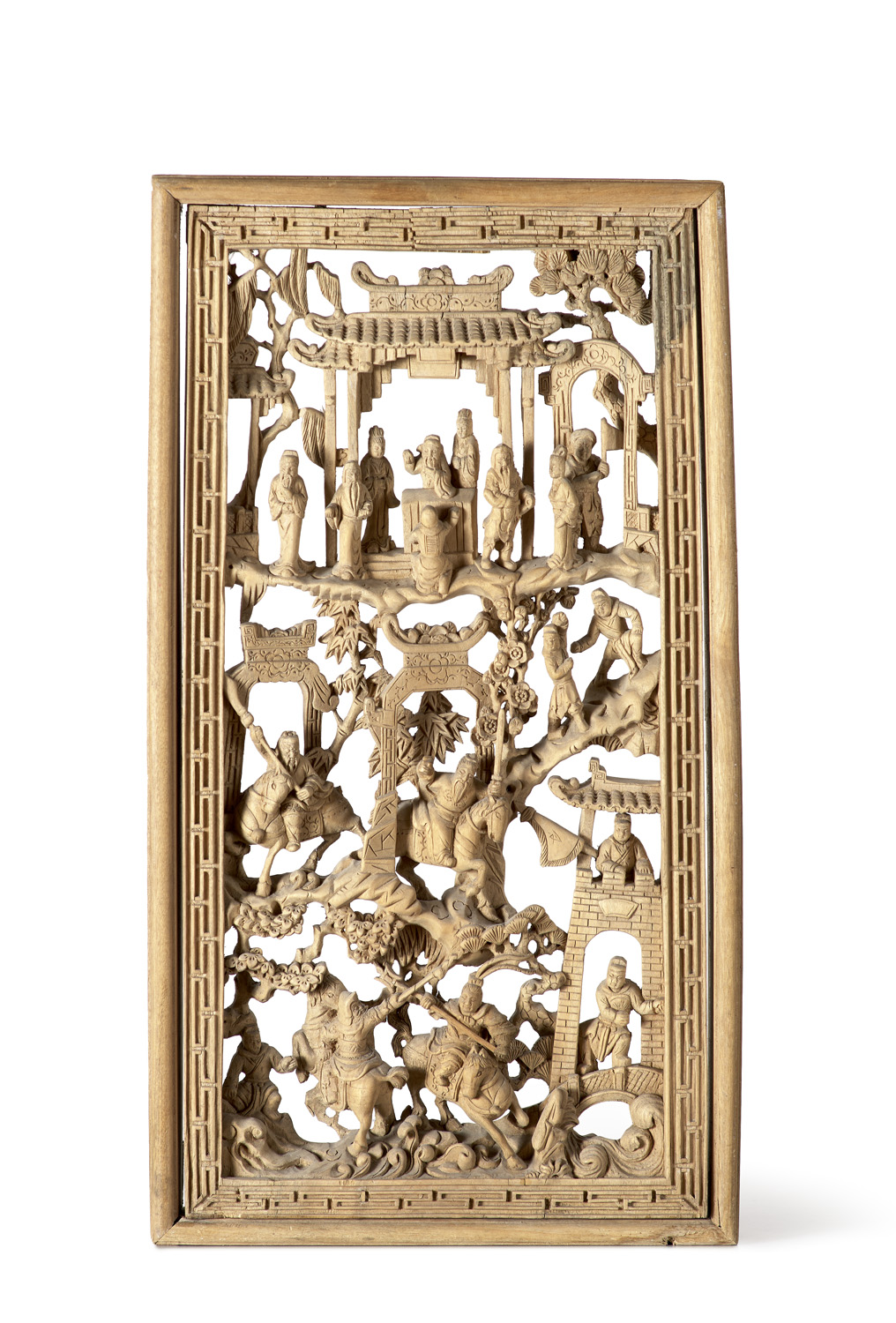 Geographie und Reisen – Das Relief erzählt höchstwahrscheinlich eine Szene aus dem klassischen Roman "Die Romanze der Drei Reiche" (Sangokushi Yanyi), einem der populärsten Werke der chinesischen Literatur über die Kriege zwischen den Reichen Wei, Shu und Wu nach dem Han-Reich-Zerfall. Es handelt sich nicht um eine einzelne typische narrative Darstellung von Schlachten mit Helden, Kriegern und Höflingen - oft in Tempeln oder Ahnenhallen zur Vermittlung von Tugenden wie Loyalität und Heldentum verwendet. Zentrale Pavillons mit mehreren Ebenen und geschwungenen Dächern, umgeben von Kämpfenden zu Pferd und Fuß, Brücken sowie Pinien und Felsen, passen exakt zu Beschreibungen solcher Panels aus "Drei Reiche". Die dichte Figurenstaffelung, offene Schnitzarbeit und dramatische Bewegung sind stilistische Kennzeichen dieser Erzähltradition, die seit Ming/Qing-Zeit in Holzschnitzereien verbreitet war. - Obere Einfassung des Relief mit Einriss, sonst wohlerhalten.
