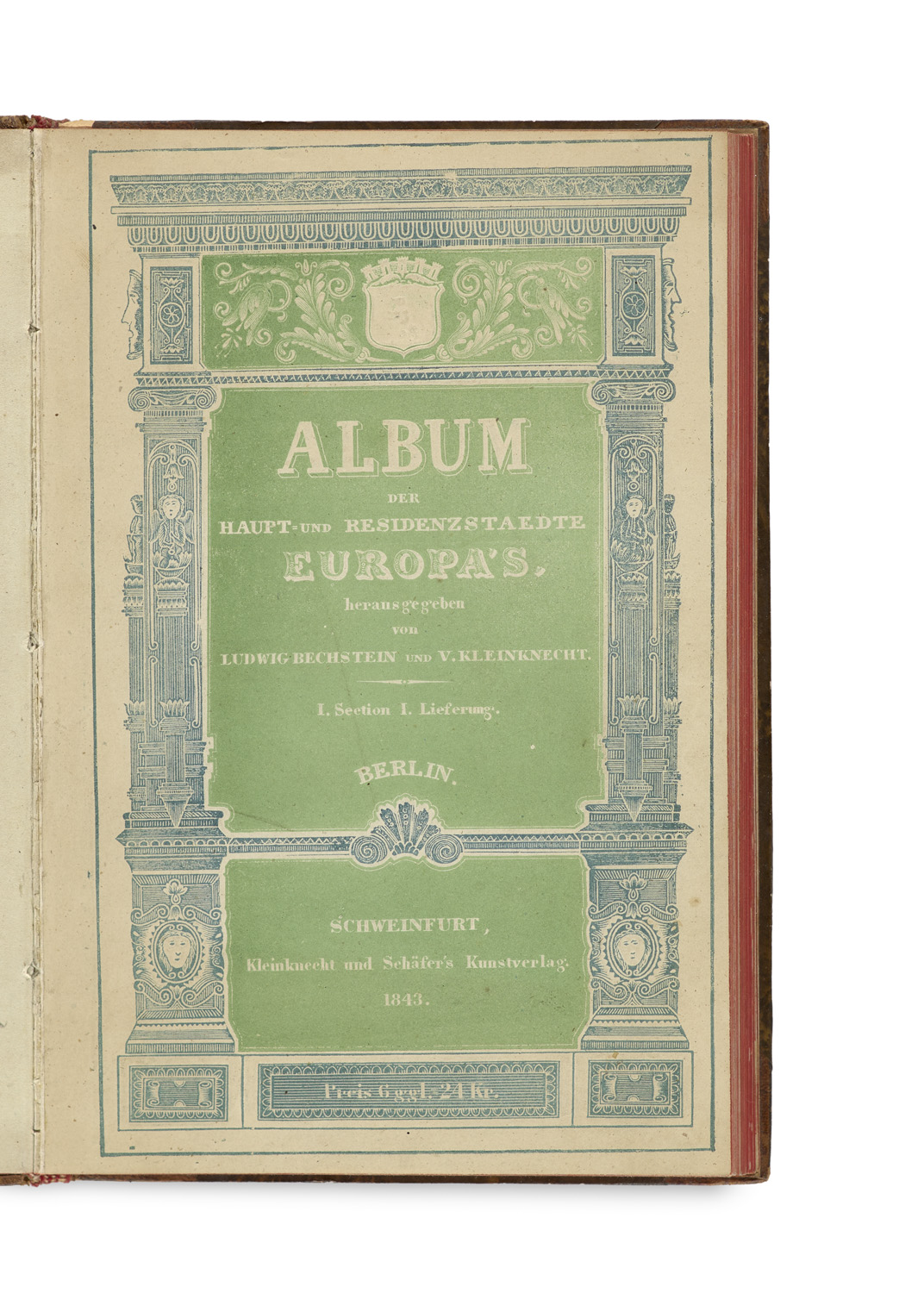 Album der Haupt- und Residenzstaedte Europas. 3 Teile in einem Band. Mit je einer gestochenen Karte und einer Ansicht. Schweinfurt, Kleinknecht und Schäfer's, 1843. 8°. HLdr. mit goldgepr. RSchild und Rotschnitt (berieben und bestoßen).