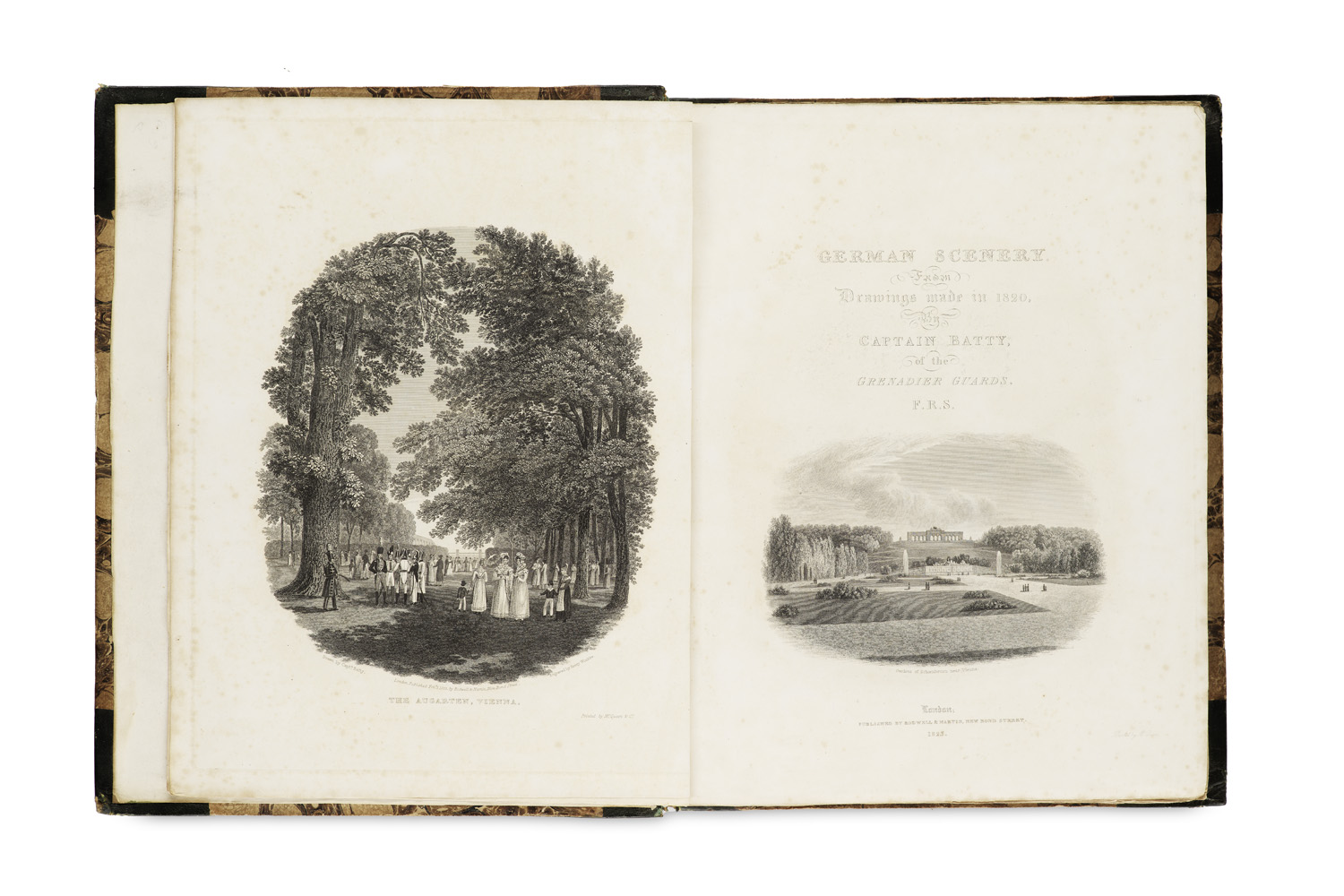 German Scenery. From Drawings made in 1820. Mit gestoch. Titelvign. u. 60 Stahlstichtafeln u. 1 ganzseit. Schlußvign. London, Rodwell & Martin, 1823., 65 Bll. HLdr. d. 19. Jhdts. mit RTitel (stärker berieben).