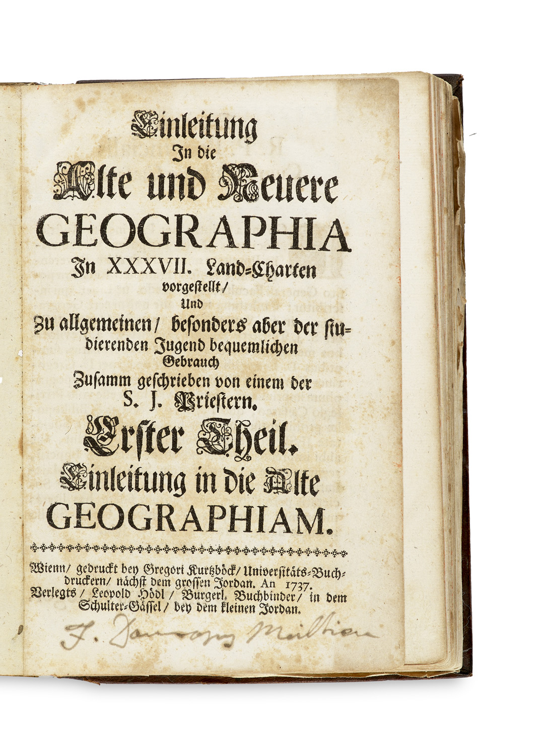Einleitung in die Alte und Neuere Geographia in XXXVII Land-Charten vorgestellt, Und zu allgemeinen, besonders aber der studierenden Jugend bequemlichen Gebrauch zusammengeschrieben. 2 Teile in 1 Band. Mit 37 meist grenz- und mitunter flächig kolorierten, teils zusätzlich radierten Kupferstichkarten von Johann Jakob Lidl. Wien, Kurtzböck und Hödl, 1737. 8 Bll., 337 (1), (recte 342) S. 8°. KLdr. d. Zt. auf 6 Bünden mit Rückengoldtitel auf Ldr.-Schildchen und floraler Rückengoldprägung (Rücken und Vordergelenk mit kleinen Fehlstellen und Einrissen, berieben).